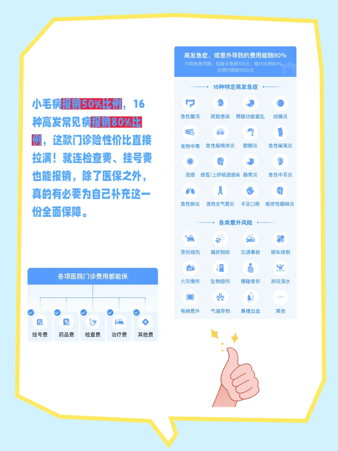 👉不怕治疗费高昂: 过敏、皮炎、鼻炎等小毛病扣除免赔额报销50%比例,肠胃炎、甲流、结膜炎等16种高发常见病报销80%比例,还不限医保内外!算下来自费部分就少之又少,性价比直接拉满!