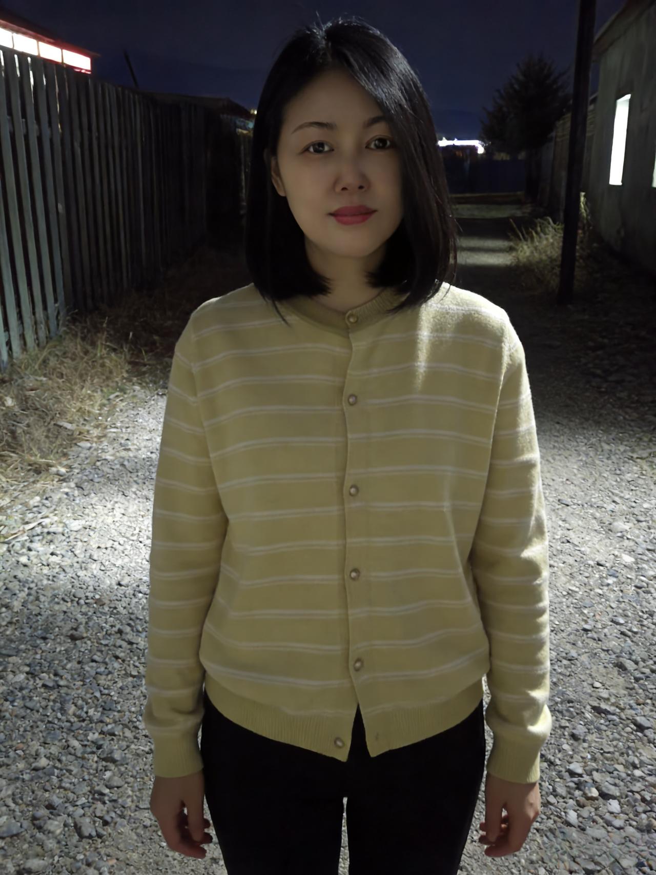夜色是粗粝的毛线 她的针织衫,是细腻的针脚 把冷缝在外面,暖留在里面 黄白条纹,是昼与夜的衔接 短发垂落,遮住半耳 像藏起一些,不想被听见的私语 碎石路硌着鞋底,也硌着生活 她的站姿,却稳如松 灯光在她身上,画着明暗 而她,是自己的光源