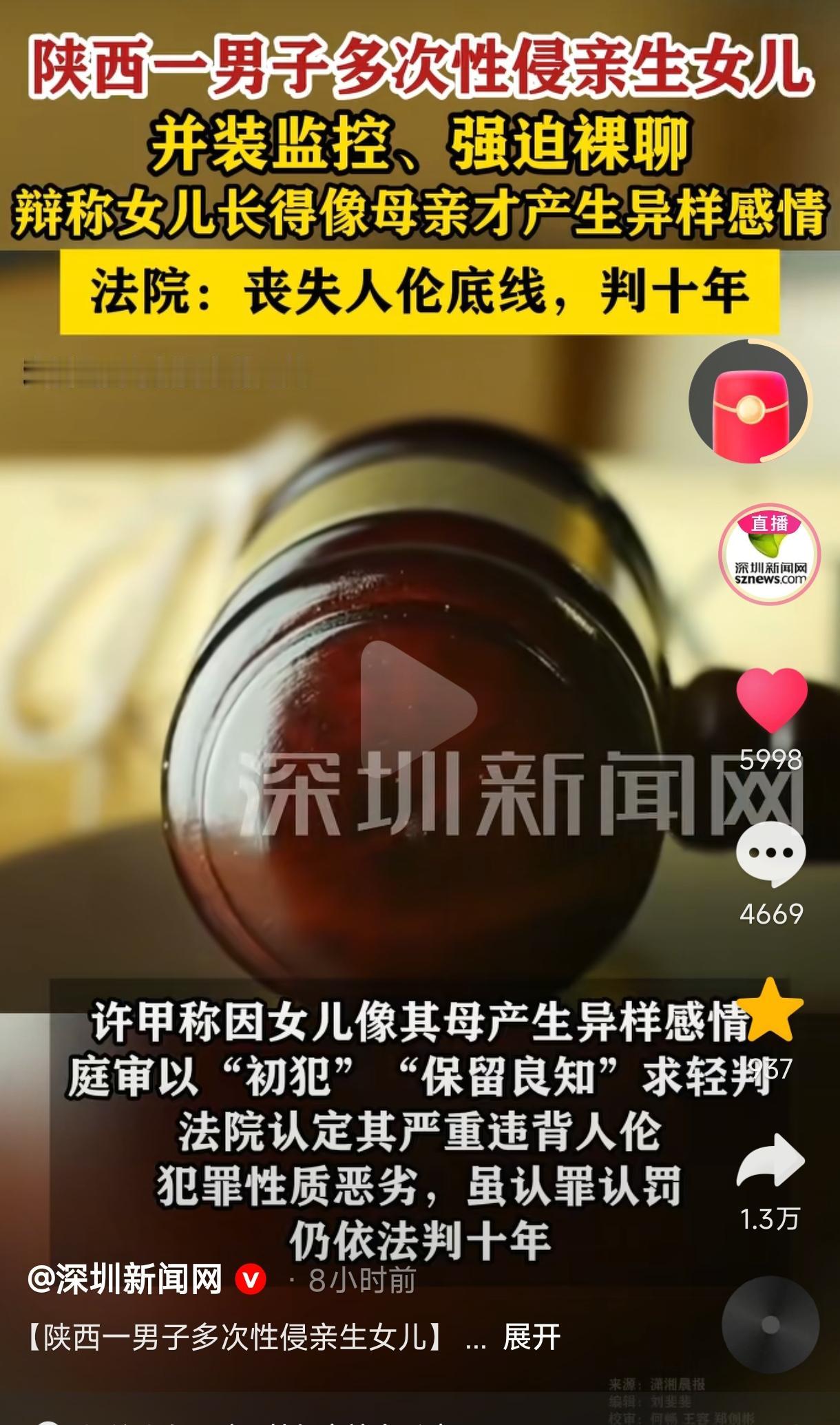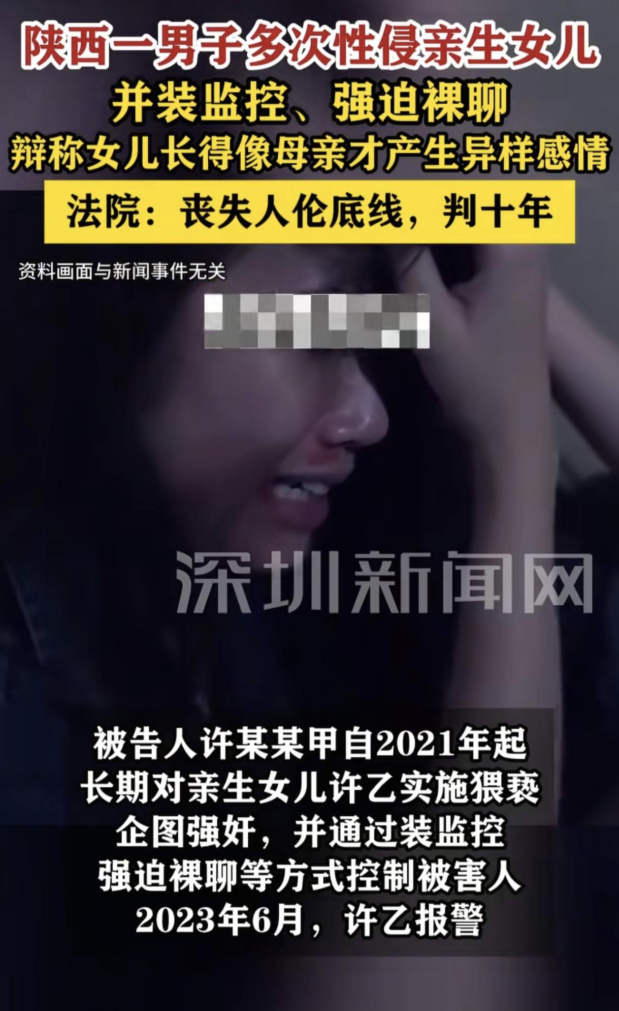 陕西山阳,男子多次侵犯亲生女儿,还装监控要求LUO聊,甚至猥亵等,女儿长大后报警称被父亲强J,当天父亲锒铛入狱,父亲却辩称女儿长得太像她母亲了就对她产生了男女之情,还称女儿母亲明知自己品行还将女儿留下也有一定责任,最终男子以涉强奸罪、强制猥亵罪等获刑10年。网友:人伦尽丧! (来源:深圳新闻网等) 不得不说,女孩许乙的一生过得太悲惨了,她出生于2008年,是父亲许甲与母亲相识三年未婚生下的她,她出生刚刚3个月,母亲就狠心离开了父女俩。 母亲的失望离家出走,估计已经看清了许甲的为人,却没想到许甲竟是一个连亲生女儿都不放过的人。 而正是母亲的这一决定,将女儿推向了深渊。 之后许乙跟着父亲一起生活,父亲既当爹又当妈的抚养她长大,按说早已建立了深厚的父女情,没想到父亲的内心竟住着一个色魔,他竟将魔爪伸向了自己的亲生女儿。 随着时光的流逝,许乙逐渐长大了,而且越长越好看,父亲每每看到女儿,似乎恍惚间看到了女儿母亲当年的影子。 2021年,13岁的许乙跟随父亲回老家祭祖,趁四下无人,父亲就想要侵她,许乙十分害怕,拿了一把小刀抵在脖子上以死相逼,父亲担心闹出人命这才罢手。 但父亲仍然没有放弃觊觎之心,2022年5月许乙被父亲阻隔着N裤猥亵,事后父亲还擦干净污物,此后又多次发生此类事。 2023年,父亲外出务工前,事先在家里装了监控,之后要求许乙与他LUO聊,许乙打算离家出走,被父亲发现端倪赶回家暴打一顿,当晚又强行猥亵许乙多次。 当时许乙已经15岁了,也知道父亲的行为是违法的,于是于同年6月28号报警称被父亲强奸,当天许甲就锒铛入狱。 许甲对自己的行为认罪认罚,同时对警方辩称,是因为女儿太像她母亲了所以才对她产生了男女之情,还有女儿的母亲明知他德行还将女儿留下她也有一定责任,请求轻判。 最终,法院审理认为,虽然许甲严重违背人伦,性质相当恶劣,但因是初犯且保留良知且认罪认罚,因此以涉强奸罪、强制猥亵罪等依法判刑10年。 这个案例看得让人愤懑不已...... 许甲以女儿像母亲为由辩解推卸责任,试图将兽行合理化,毫无悔意与良知,完全突破了人类文明的基本底线,是人性与伦理的彻底丧失。 我国刑法第236条规定,奸Y不满14周岁幼N且情节恶劣等10年以上至死刑。本案许甲作为监护人却长期利用特殊身份侵犯受害人按说应从重处罚,但考虑到他本人认罪认罚还有良知最终判10年。 虽然没有顶格处罚,与公众的期待存在差距,但估计也是看在其认罪态度较好,给予了从轻处理吧,毕竟法律不外情理。 作为父亲,许甲本该好好对待没有了母亲的女儿,没想到却利用血缘关系与监护人身份之便以龌龊之事,这既是人伦的泯灭,也是对法律的践踏! 最可怜的还是女孩许乙,从小就失去了母爱,稍微长大一点又遭到父亲的欺负,她今后的人生该怎么度过?这样的阴霾与伤害怕是一辈子都难以走出。