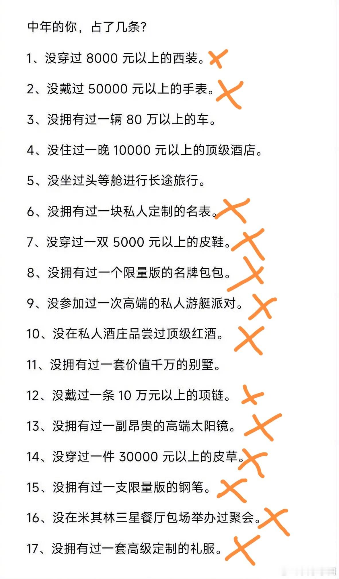感觉每年都有一套测试题我认真做一下1、8000以上西装真没有,大学时候校服是西装,3000多一身,再贵舍不得了2、50000以上手表实际没花这么多,在瑞士买过一块三万多的,多年后公价涨到了6万3、80万以上的车和表一样,指导价80多万的宝马7系,我60出头捡便宜时候买过4、10000以上酒店没住过5、头等舱长途旅行没体验过,商务舱工作原因经常会升舱6 7 8 9 10 都没有11、价值千万的别墅没有,但是真想过要买小独栋,原因是我和其乐都怕吵,有机会找一个百万的吧12 13 14没有15、不知道标准是什么,几千的钢笔有16、17 没有做完了再看,标题不对 北京