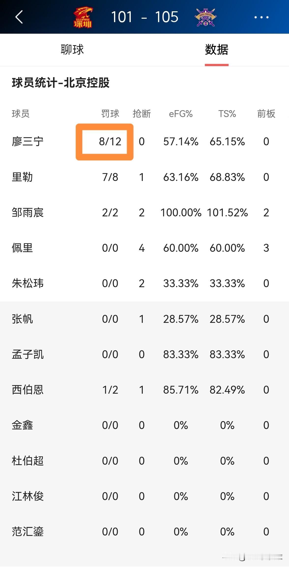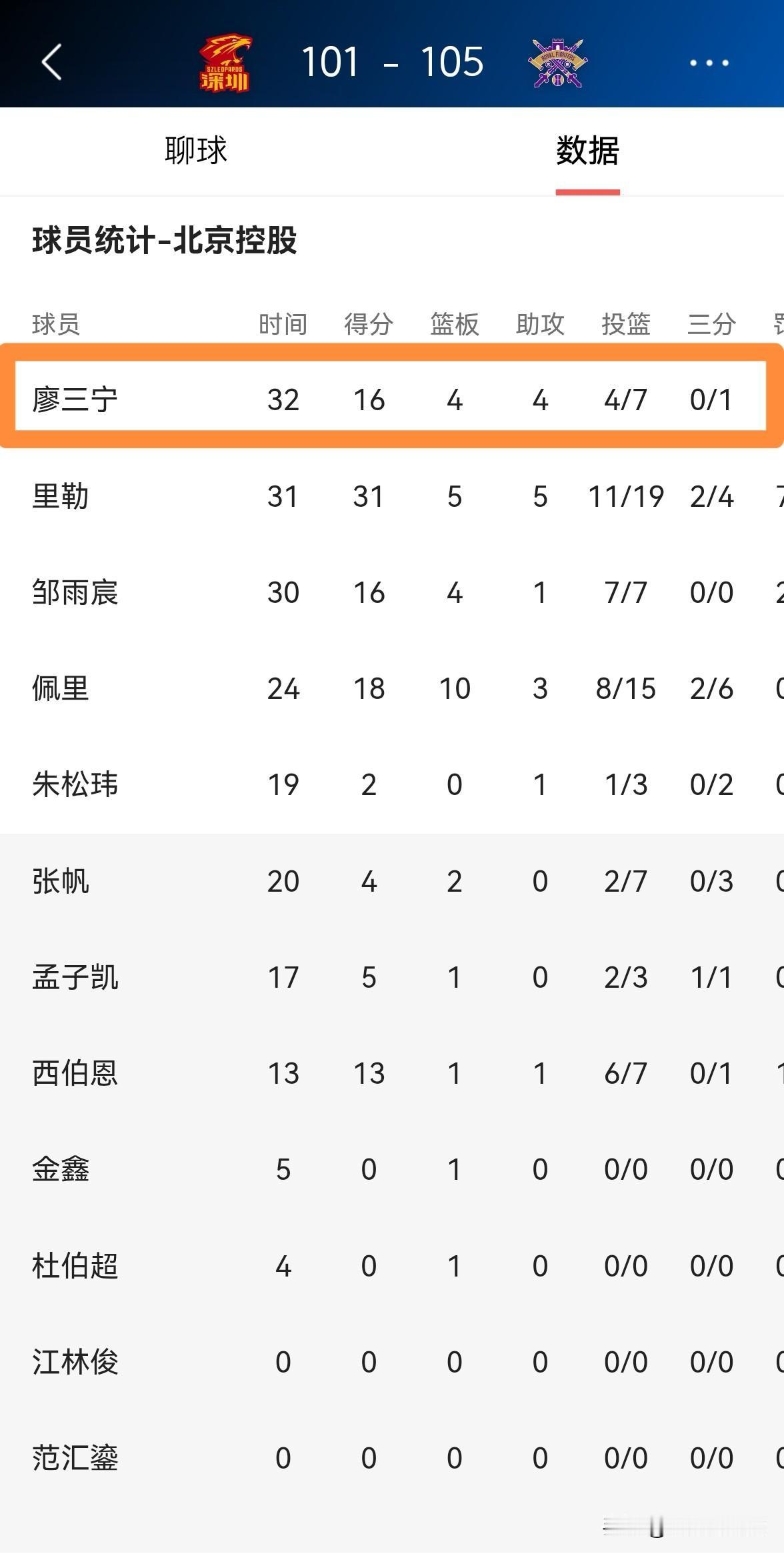 我忍不住要怒赞北京控股后卫廖三宁!在今天北京控股客场以105:101险胜深圳马可波罗的比赛中,廖三宁首发出战32分钟,投篮7中4,其中三分球1中0、罚球12中8砍下16分4篮板4助攻,他的场上正负值为+8。 本场比赛廖三宁将自己出色的突破能力展现的淋漓尽致,全场比赛下来廖三宁一共博得了12次罚球,可以说是侵略性十足。