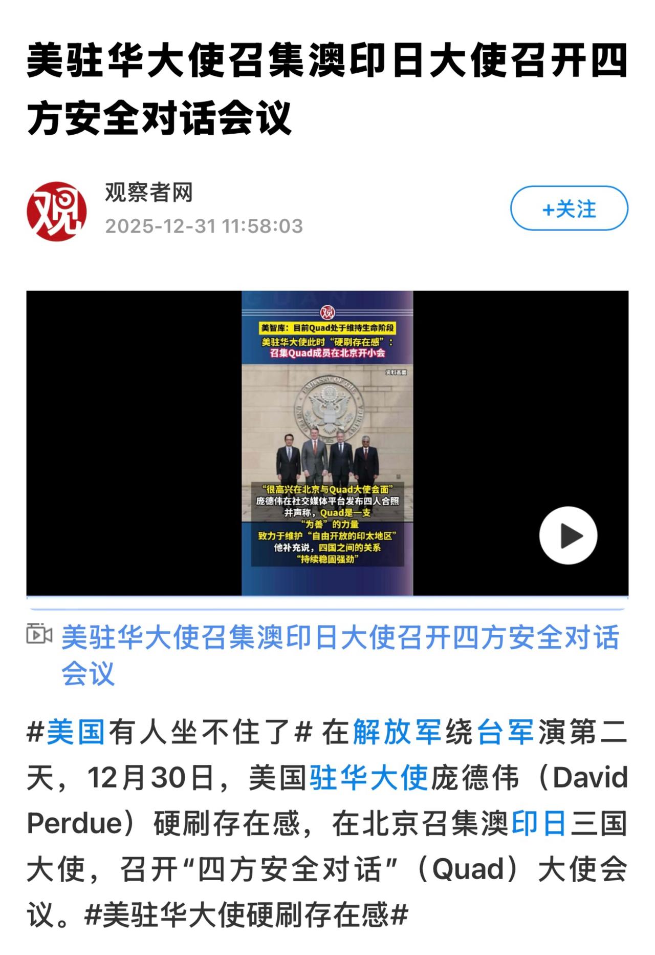 庞德伟称,四方安全对话是维护自由开放的印太地区的为善的力量。“很高兴在北京与四方安全对话各国大使会面。美国、澳大利亚、印度、日本四国关系持续稳固强劲。” 四方安全对话在北京举行的大使级会议并非新鲜事。自2024年中以来,在庞德伟的前任伯恩斯任内,这类协调会议便已举行,并延续至2025年。但此次会议的举行时机仍格外引人关注。