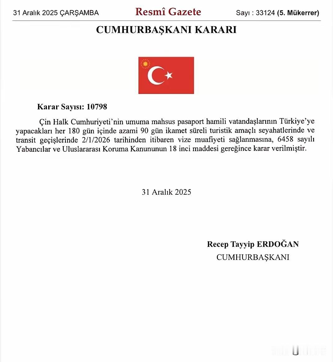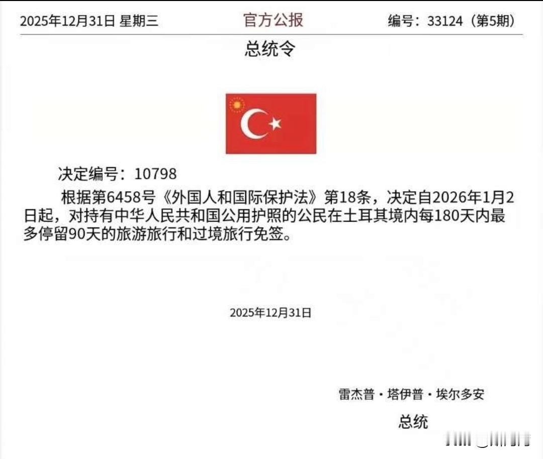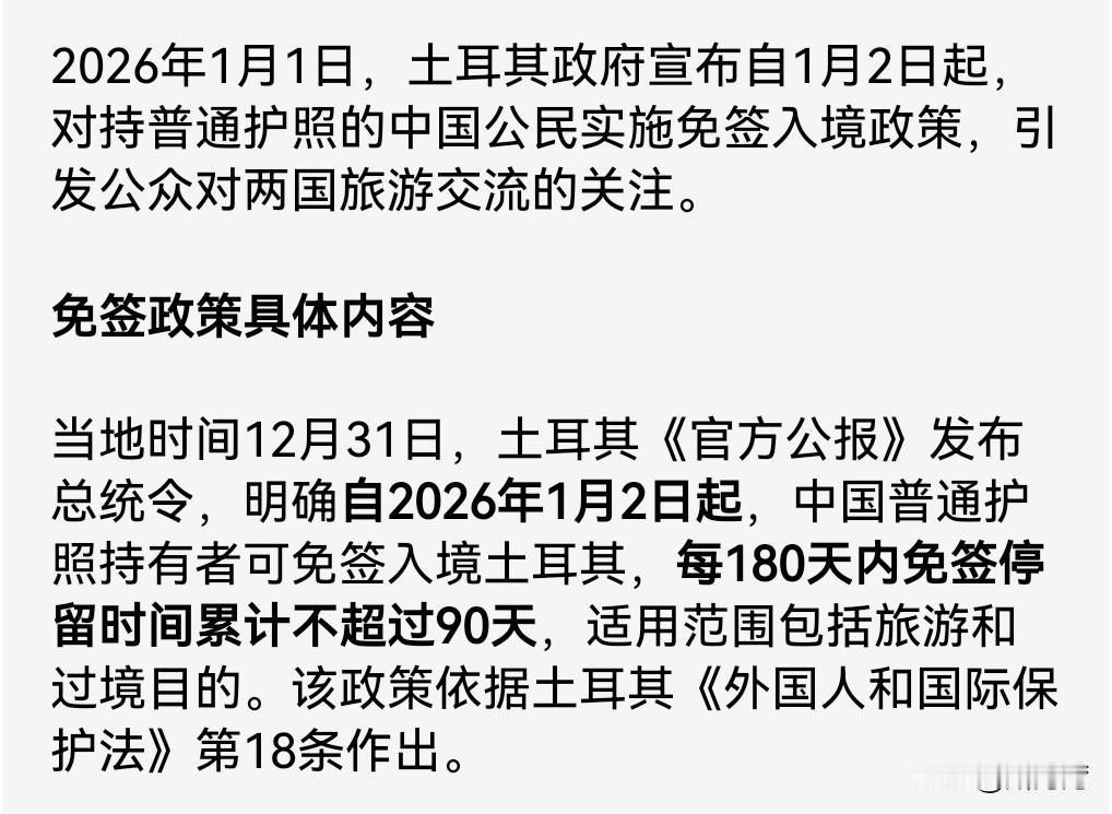 为了抢中国观光客,土耳其突然放大招,太聪明了! 2025年12月31日最后一刻,土耳其突然对中国放大招。埃尔多安正式签署总统令,决定自2026年1月2日起,为中国持普通护照的公民前往土耳其实行免签,每180天内最多停留90天。 2026年新年伊始,土耳其为中国公民赴土耳其送上了大礼,相信触发土耳其做出这一决定很大程度是中日交恶因素,中国旅客是多么大一个蛋糕,不放大招抢太对不起钱了!