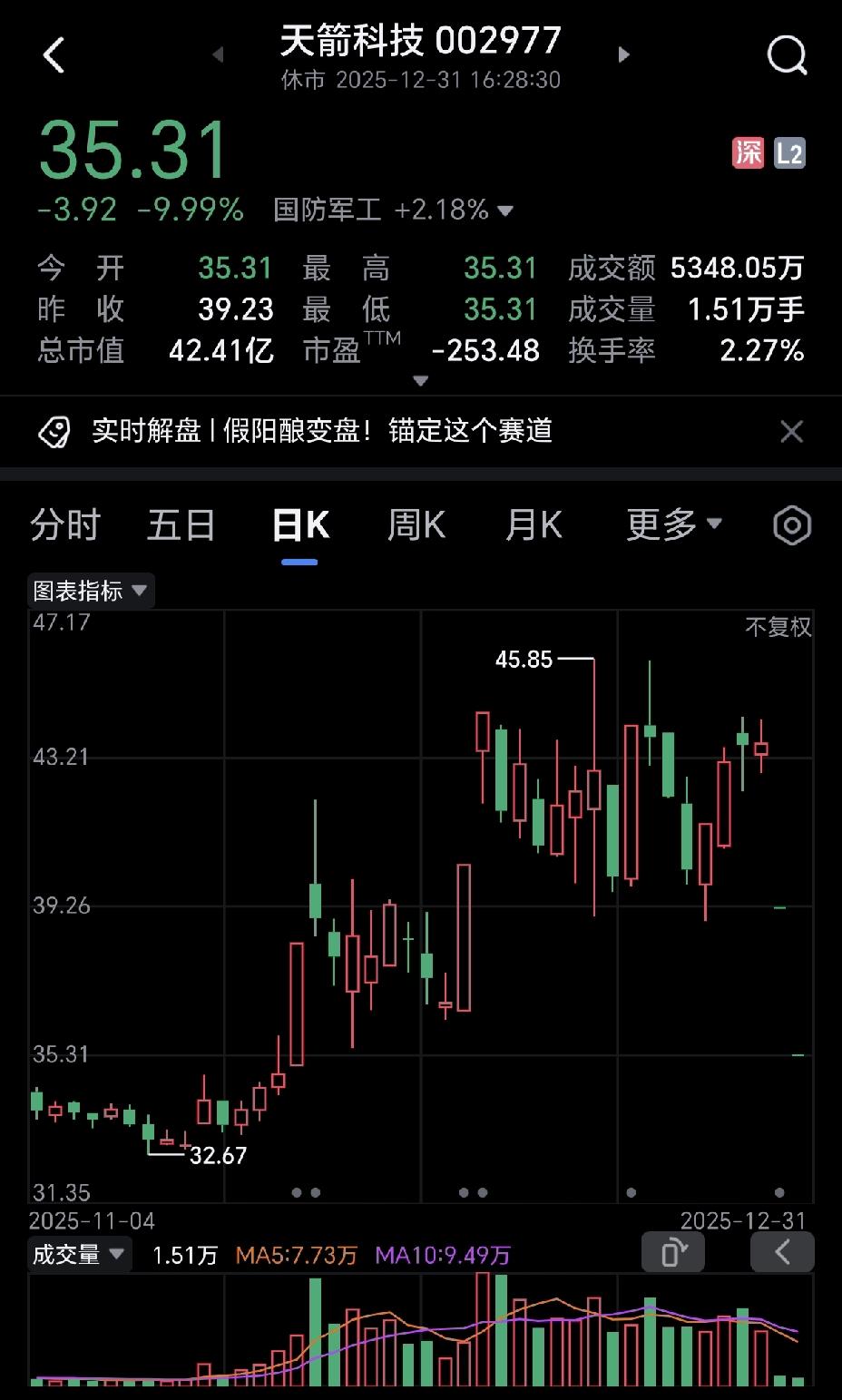 2025年底谁最惨,必定是买了天箭科技的人,本来涨的好好的,大批股民买入,结果一夜间,收入调减2.56亿,利润成了-2.09亿,股票可能被实施退市风险。 这不是要人命吗?最后两个交易日直接跌停,想跑的机会也没的。 有网友预计,这只股票会直接跌到20元以下才会收住下跌趋势,可能还不止。 这就是股票退市风险的狠劲,谁买谁遭殃。蓝箭科技 天剑科技 天铁科技