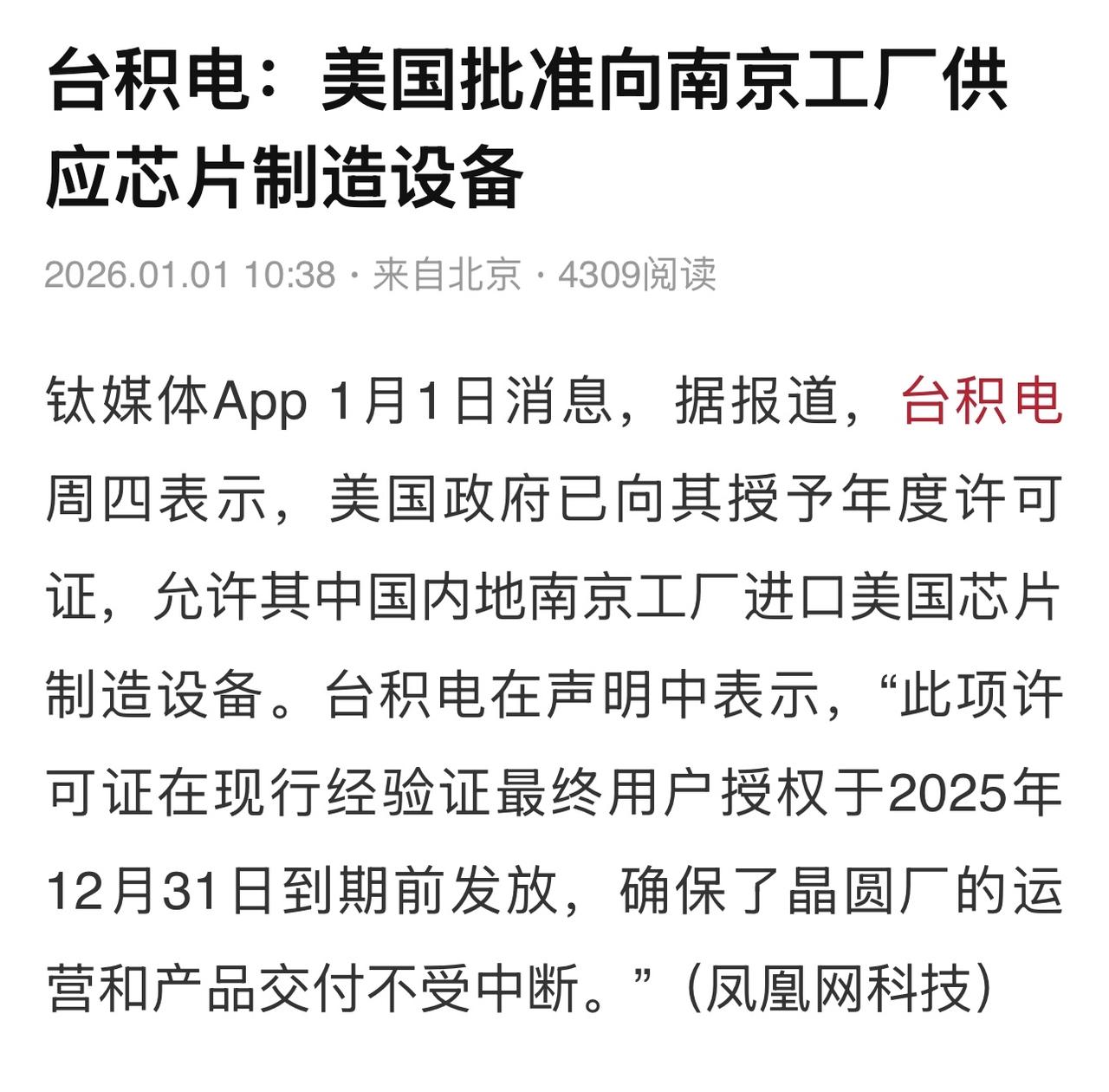 台积电获年度许可向南京厂输出美产晶片制造设备 据悉,三星、SK海力士等也获得了类似许可。相关企业自此需逐年获取许可,才能继续对华出口相关设备。 此外,据外媒报道,由于中国科技公司已预订超过200万颗英伟达H200芯片,远高于其现有库存,台积电预计将在2026年第二季度启动增产。