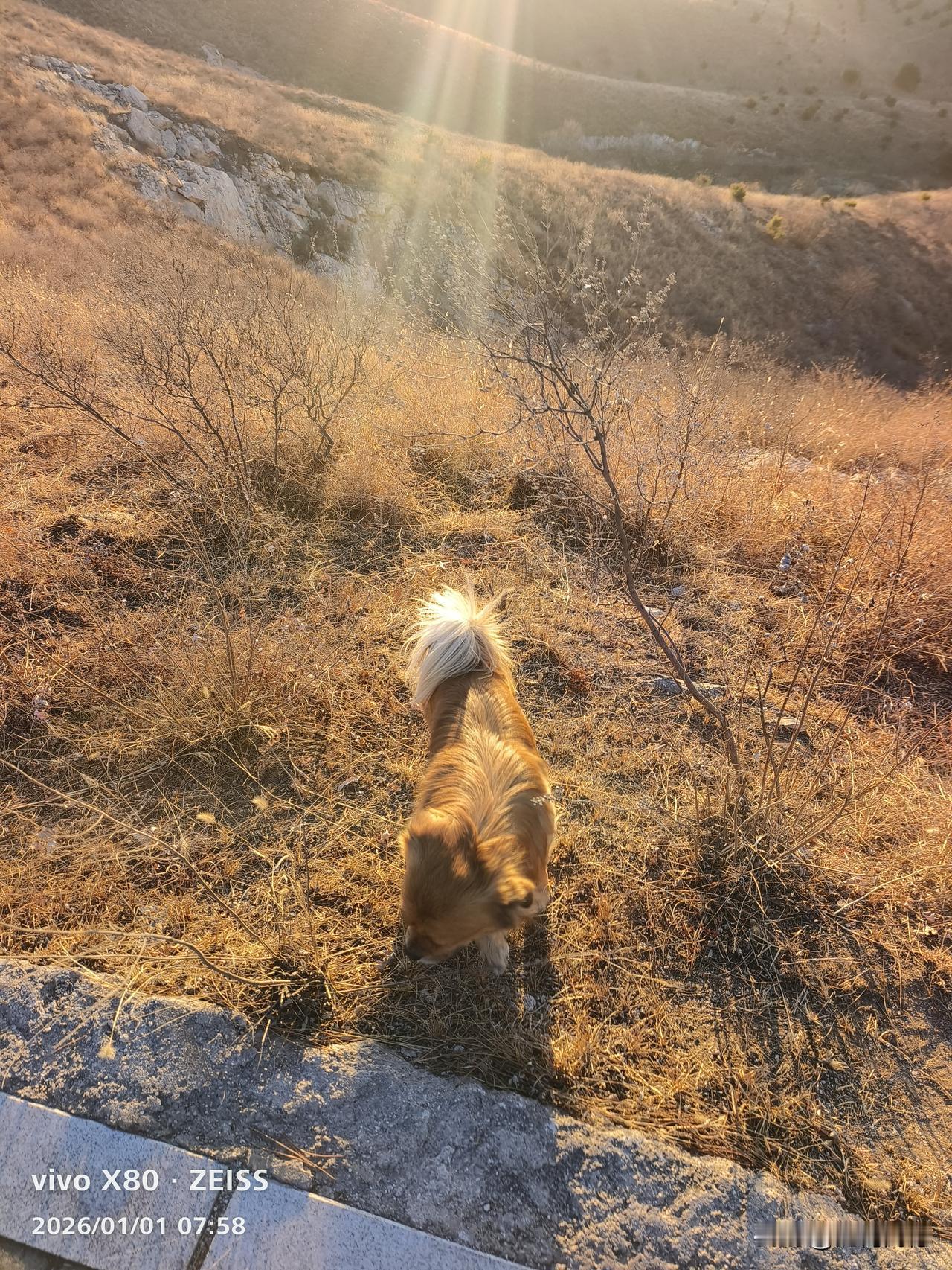金色的地面,金色的阳光,金色的毛孩子,拍照主人迎接新一年新一天的到来,走在山路上,趴在山坡上,毛孩子非常的兴奋,这边瞅一瞅,那边看一看,也许它已经感受到了新年的氛围,2026年,新的一天已经开始,一切都是如此美好,一切都是如此浪漫,一切都是如此温馨!