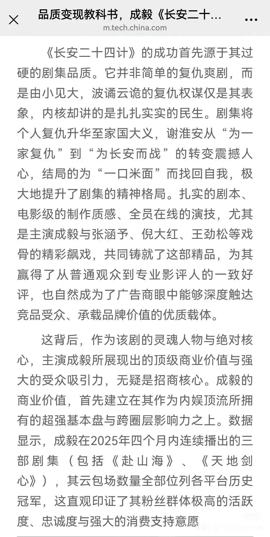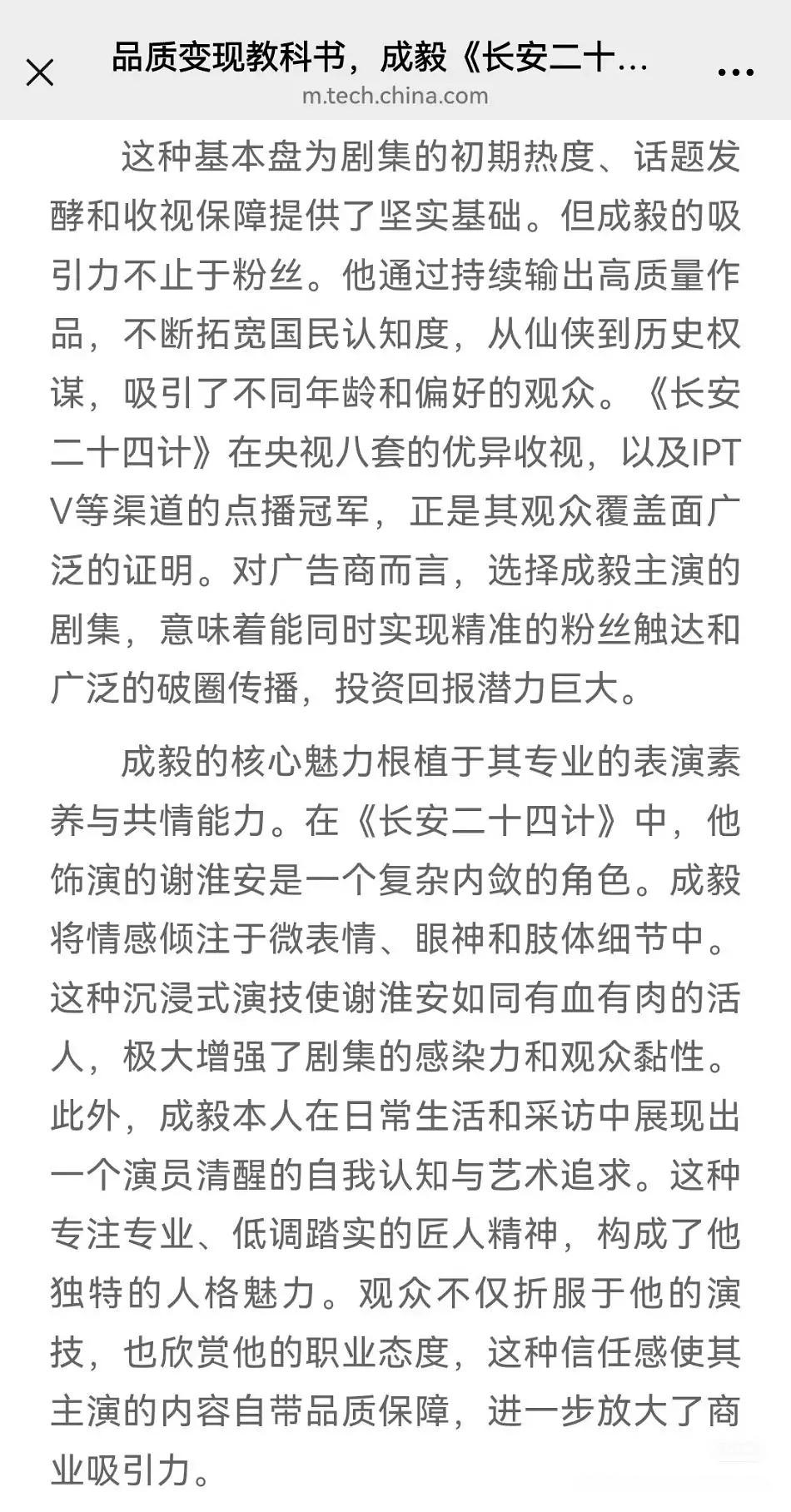中华网发文:成毅《长安二十四计》,品质变现教科书,招商神话刷屏,为行业树立了品质、演技与商业价值如何实现共赢的标杆 !成毅作品必属精品!