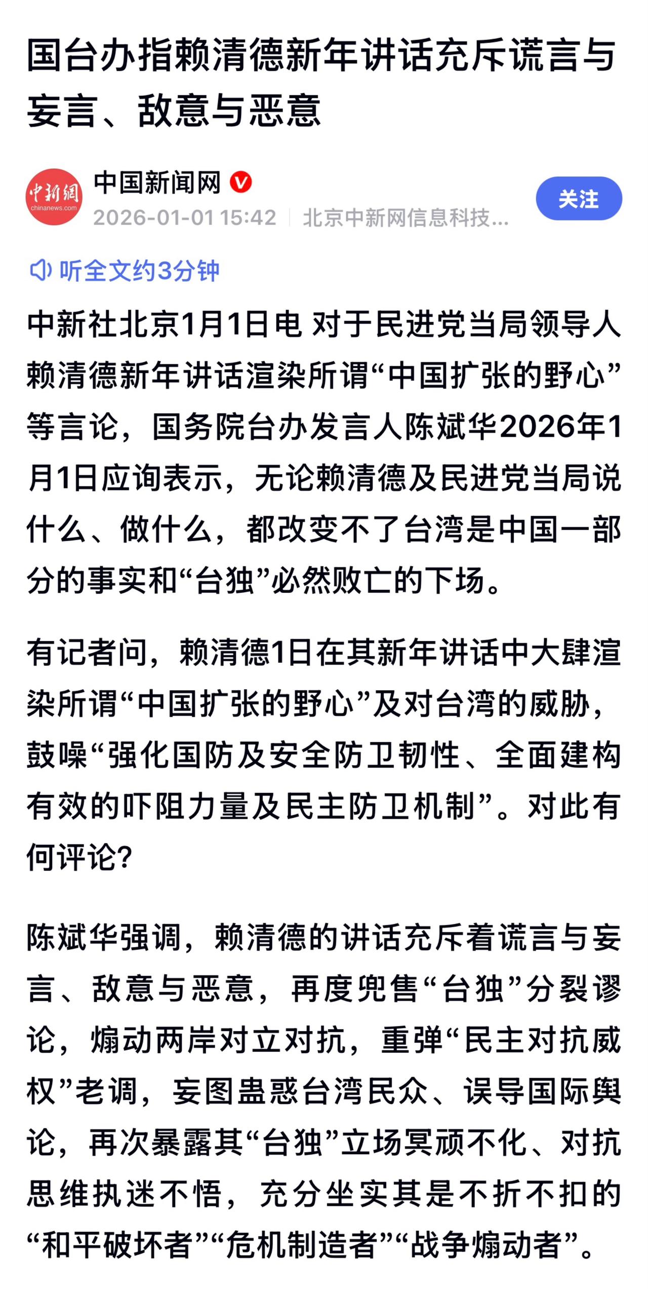 赖清德发表元旦谈话后接受媒体提问时,强调自己没有违法,质问在野阵营提出针对他的弹劾案目的何在,并直批蓝白阵营明知在立法机构的议席数量没有达到通过决议的要求,是在浪费时间。 此前据台媒报道,国民党和民众党立委对赖清德提出弹劾。根据时程,1月中下旬将由台湾地区立法机构召开审查会,邀被弹劾人说明并进行询问,5月召开第二次审查会,5月19日进行弹劾案投票。