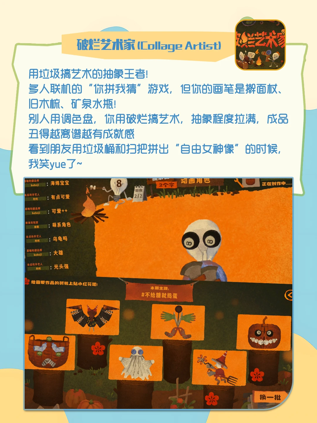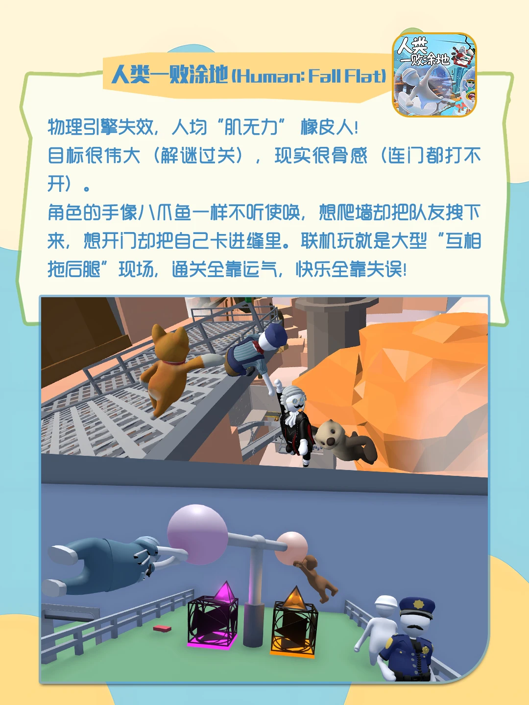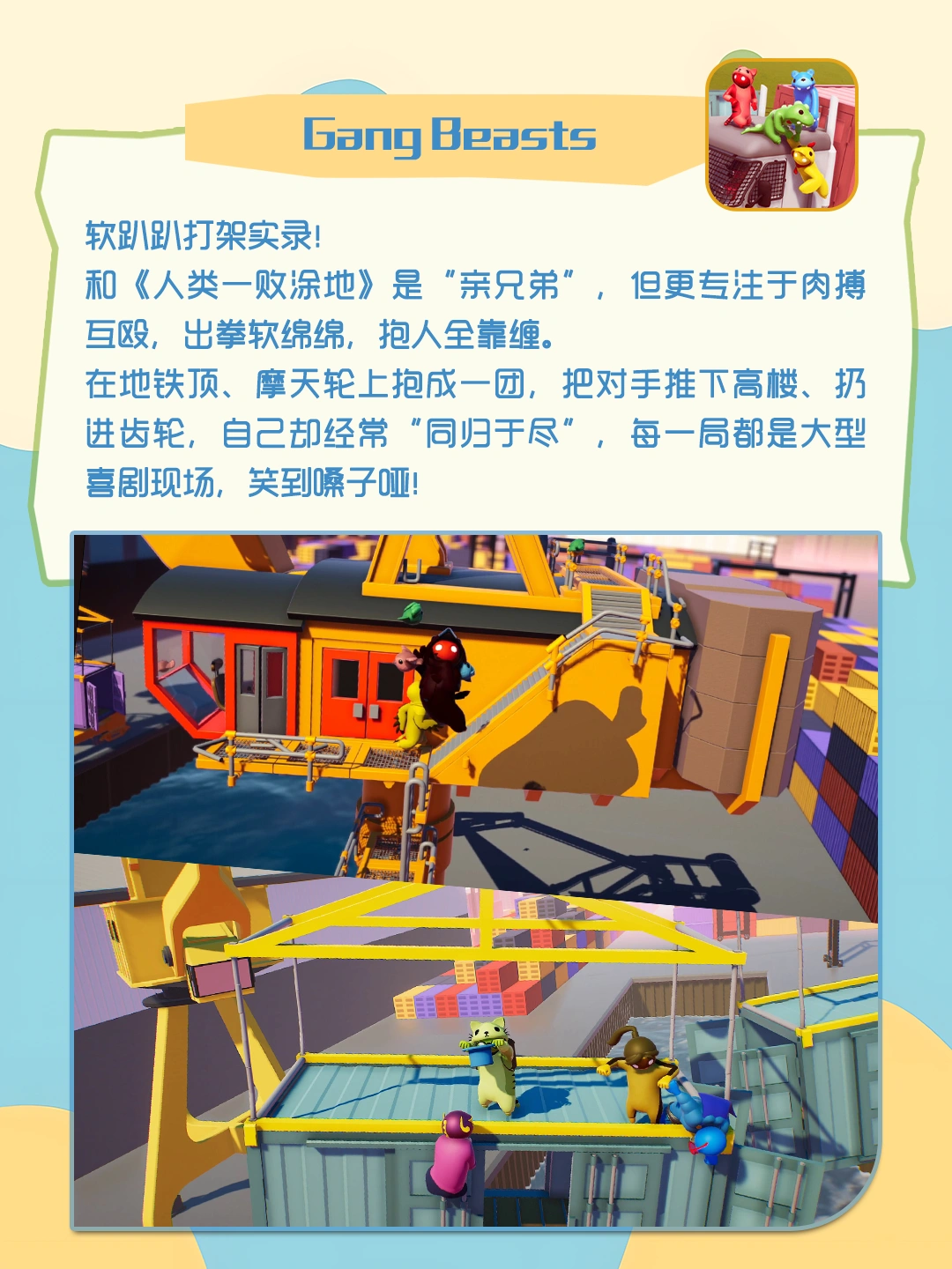 和朋友玩这些游戏,笑到打鸣家人们[大笑R] 这些抽象游戏不用费力规划流程、不用纠结输赢,全程靠本能瞎玩就够了[萌萌哒R] 主打一个随性摆烂、即兴整活[派对R][派对R][派对R] [爆炸R]破烂艺术家 (Collage Artist) [满月R]糖豆人:终极淘汰赛 [大便R]人类一败涂地 (Human: Fall Flat) [坏笑R]动物派对Gang Beasts [吧唧R]炸鸡派对 不需要动脑[黄金薯R]只需要动嘴角的快乐[得意R]和你的P人搭子一起开玩[吐舌头H][吐舌头H][吐舌头H]