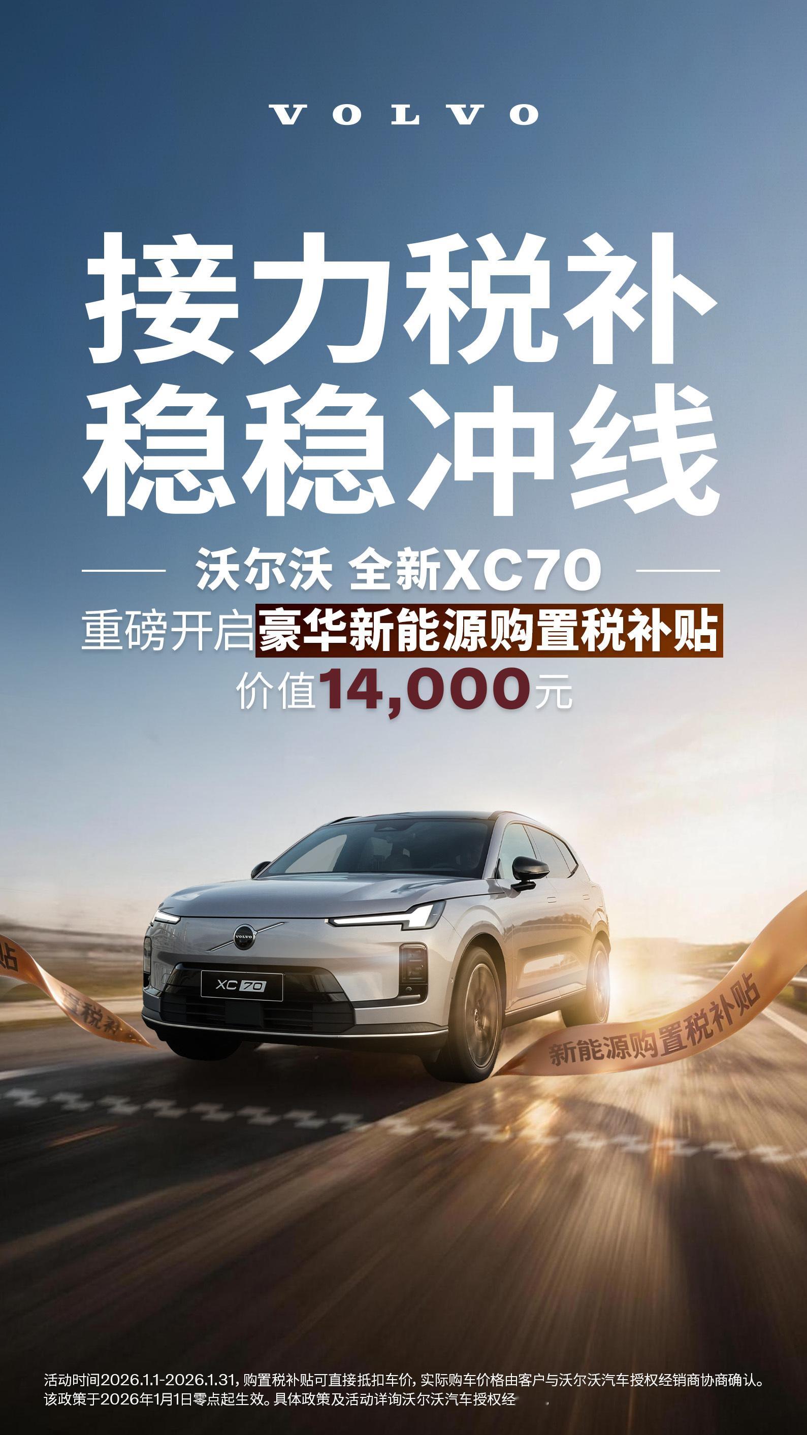 沃尔沃新年首推新能源购置补贴新年开始,各家车企除了发布销量预报。新的一年抢单大战也开始了。2026年购置税减免政策有缩水,这影响了一些用户的购车热情,于是部分车企开始自掏腰包来补贴了。沃尔沃XC70直接每台给出1.4万补贴,相当于抹平减免,把优惠力度拉回了之前的水平。之前还在犹豫的,没必要担心了