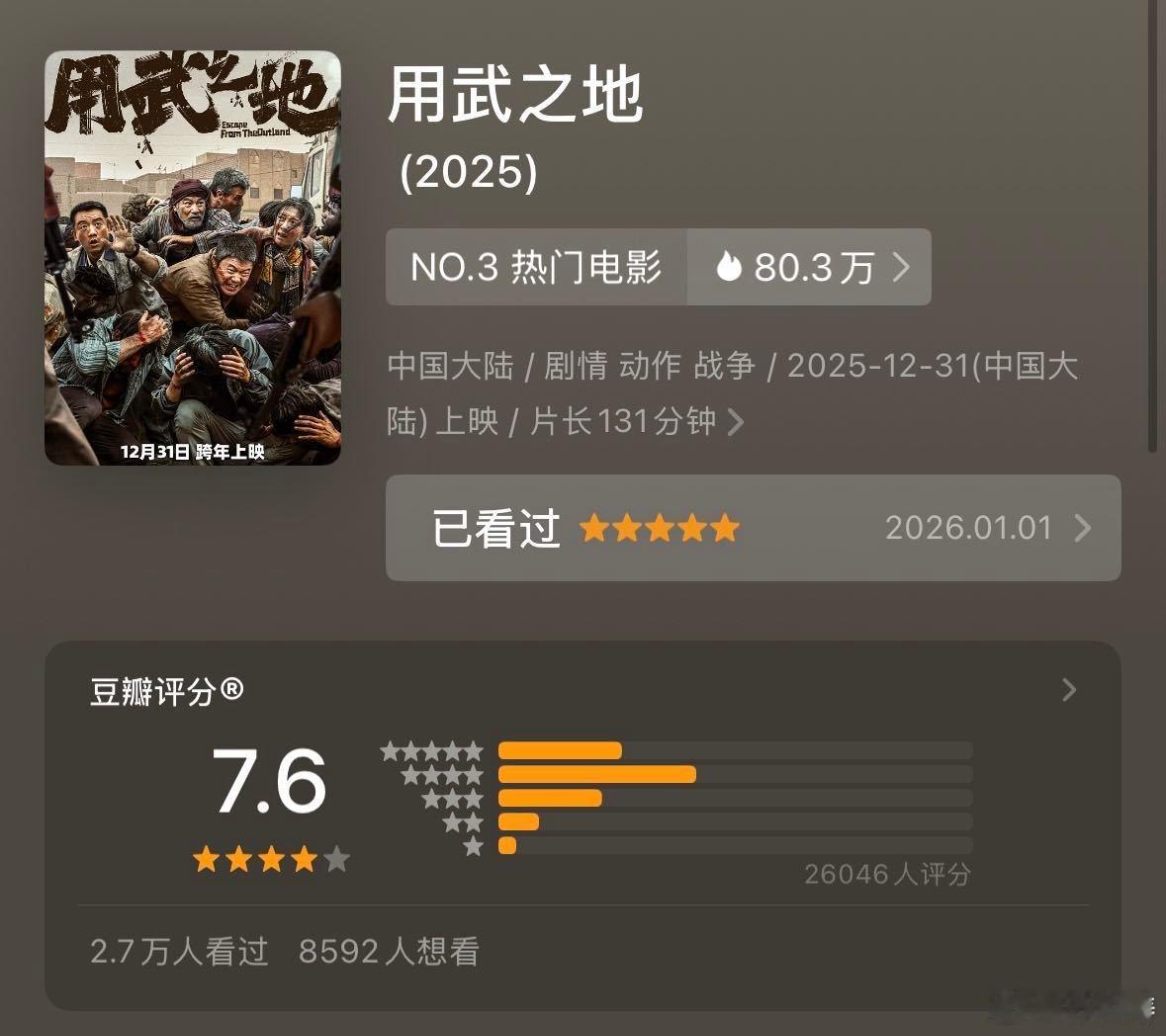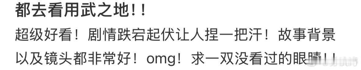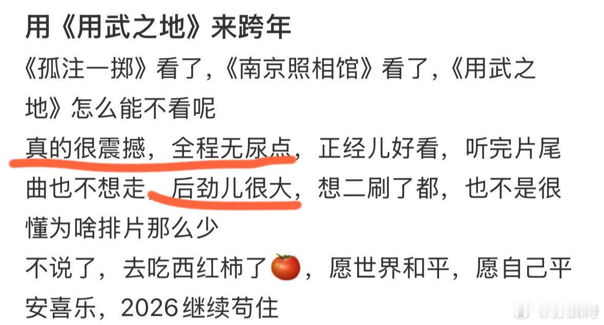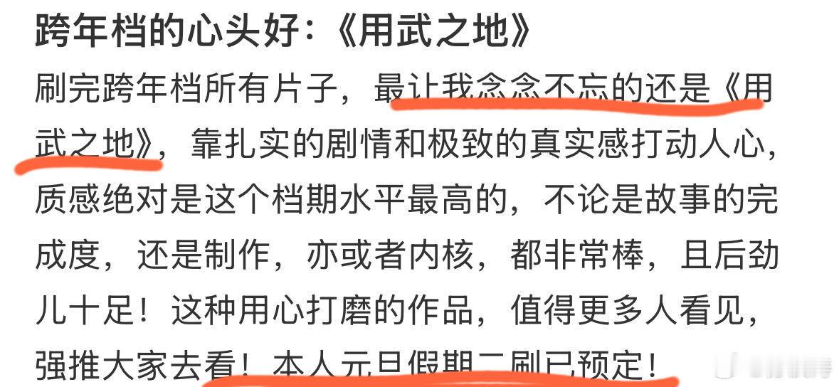 用武之地同档期口碑第一 我心里的跨年档top1它值得!!豆瓣开分7.6是元旦档国产片评分第一。我给到一个夯!因为确实好看啊,身边看过的朋友出来第一反应就是“太刺激太震撼了”,走出影院真的有种重归现实世界的恍惚感。好久没有这种感觉了,算是独一份了。沉浸感确实强,几乎是全程提着一口气跟着主角团沉浸式逃生,紧张刺激手心冒汗。完全是一部好看工整质量硬的商业大片!最后西红柿叔叔出来以后又开始眼睛酸酸,片尾曲一出直接忍不住哭了… 这才是“电影”啊!这才是啊!好作品值得被更多人看见,这个口碑第一它值得,值得看,更值得推荐!!跨年热梗制造机跨年电影愿