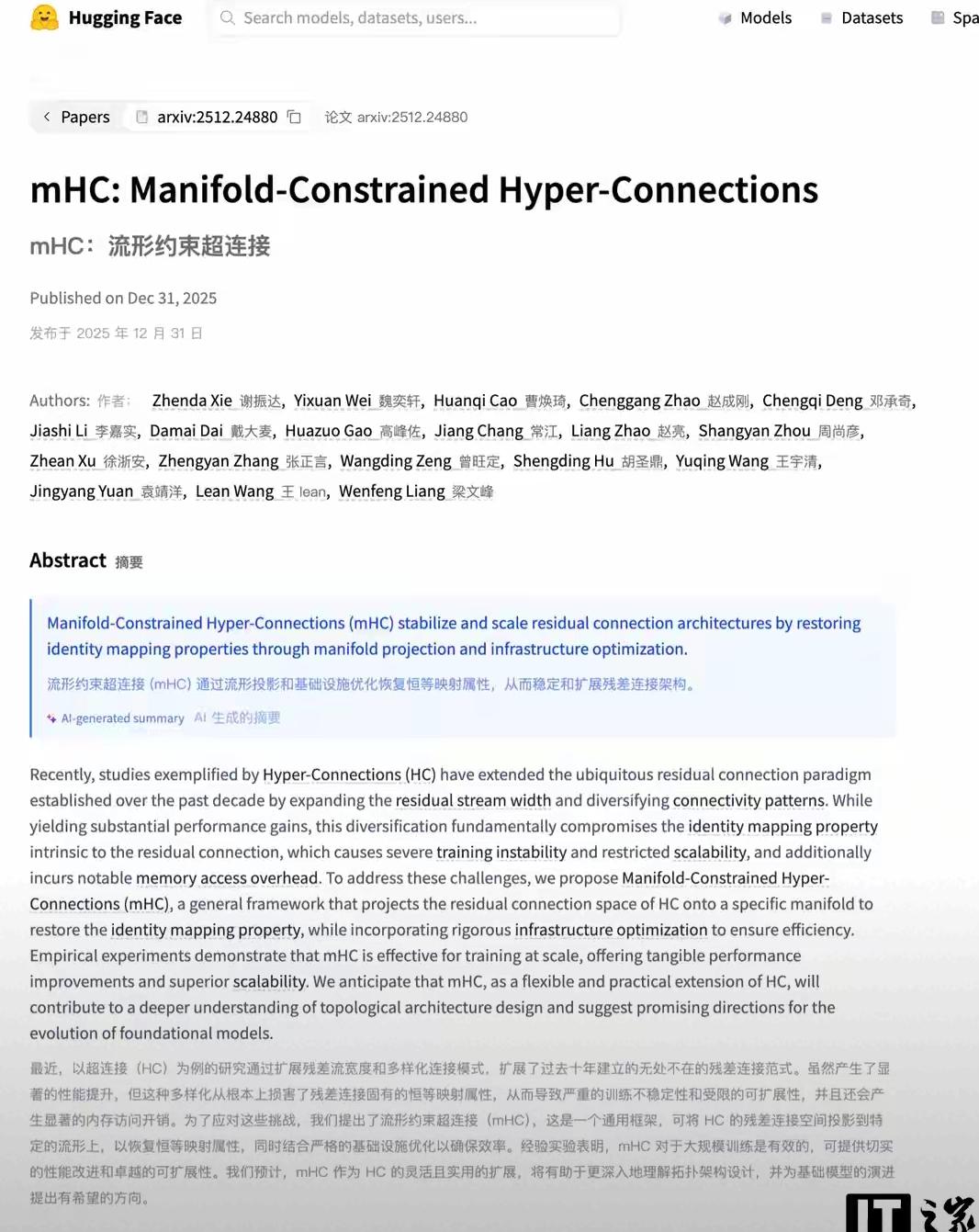 DeepSeek开年放大招!新论文提出mHC架构,CEO梁文锋亲自下场署名,这波技术突破太顶了! 传统超连接(HC)虽能提升模型性能,却破坏了残差连接的恒等映射,导致训练不稳还费内存。而mHC架构通过流形投影把HC的残差空间“拉回正轨”,既恢复了关键属性,又靠基础设施优化保证效率,大规模训练时性能和扩展性双丰收。 CEO亲自参与研究,足见DeepSeek对技术底层创新的重视。这不仅是解决一个技术痛点,更给基础模型拓扑设计指了新方向——不盲目堆资源,精准优化才是破局关键。你觉得mHC架构会给AI大模型训练带来哪些实际改变?