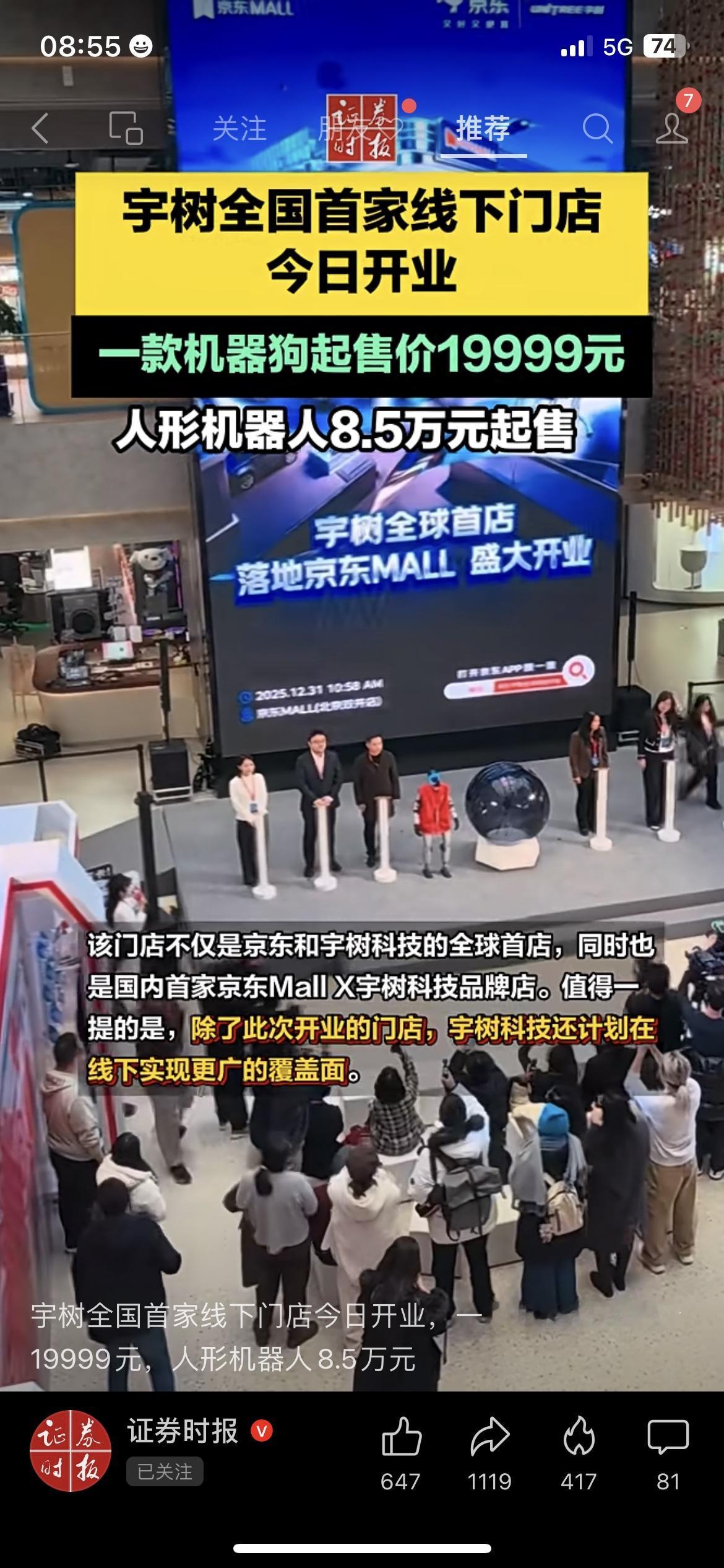 科技迷别错过!宇树全国首家线下门店在京东MALL开业,机器狗起售价19999元,人形机器人8.5万元起售。 门店能现场体验机器狗互动、人形机器人实操,感兴趣可线下买也可线上下单,超方便。 我朋友特意跑去体验,说机器狗互动性超强,就是价格有点劝退普通消费者。 机器人线下店越来越多,未来家用机器人说不定能走进千家万户! 你想体验宇树的机器狗或人形机器人吗?你觉得家用机器人多久能普及?