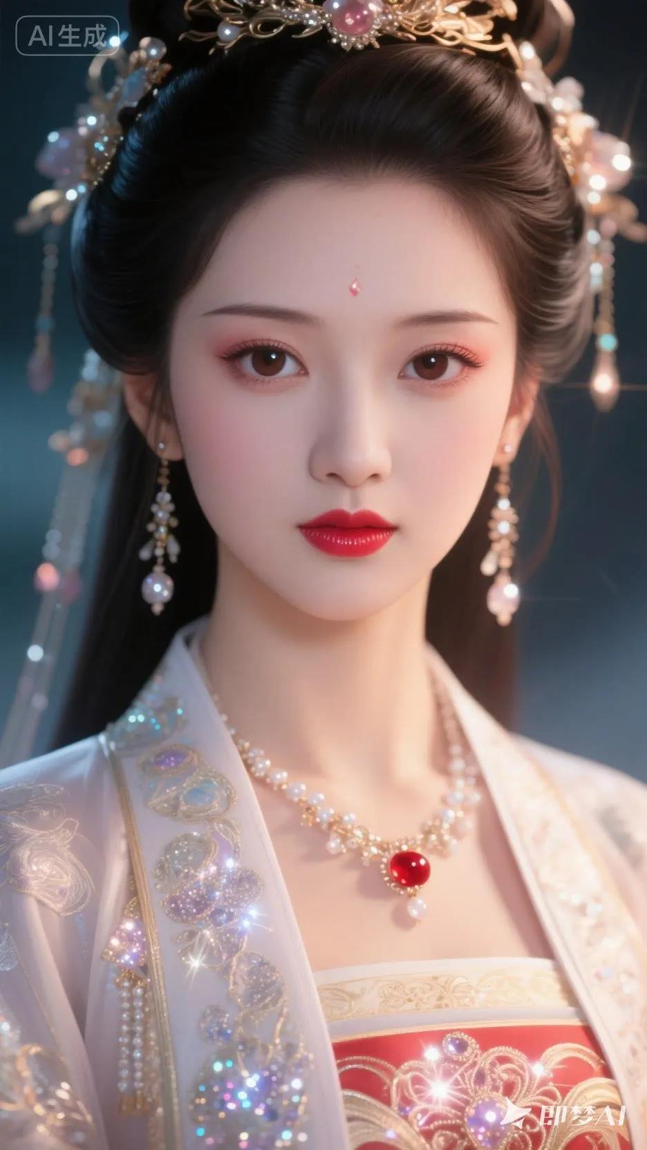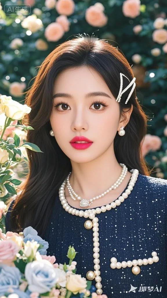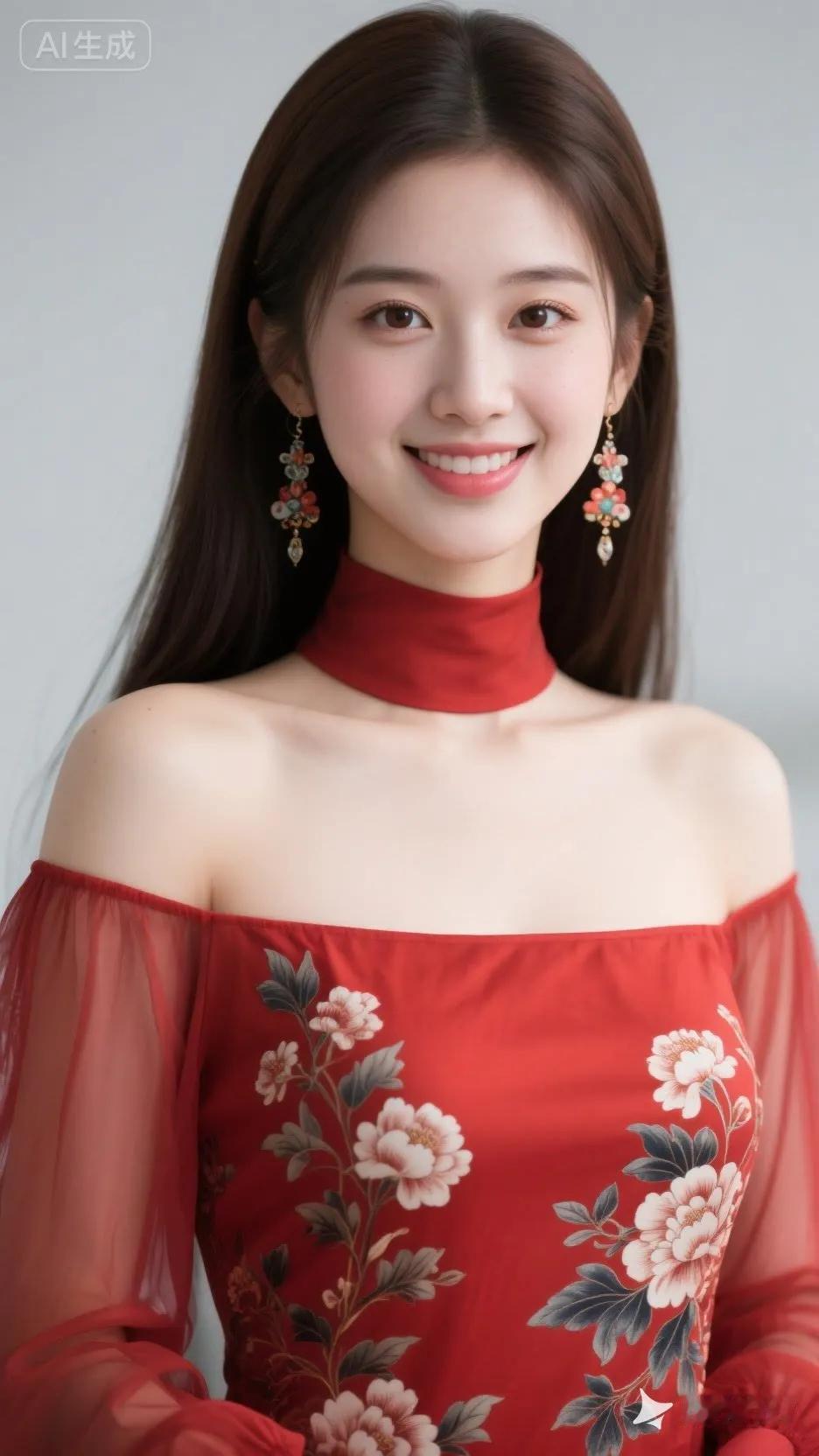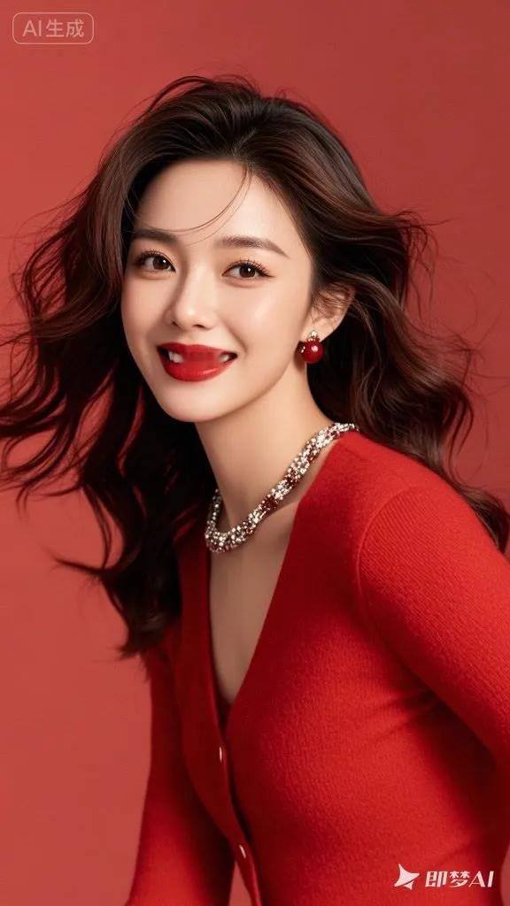 甜美笑容,红衣闪耀,珍珠耳环,优雅动人