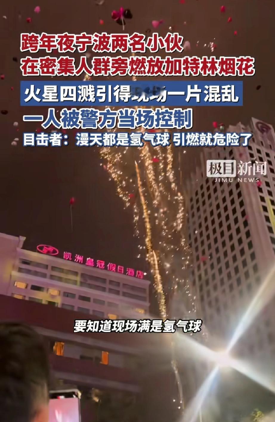 不作死就不会死!浙江宁波,大家都在天一广场庆祝跨年,没想到,倒计时结束后大家在放气球,突然几名精神小伙对着气球放烟花,结果被民警当场控制!网友:去年那个“加特林”还没出来呢 1月1日凌晨,宁波天一广场到处都是来跨年的人,大家放飞气球,热热闹闹迎接新年。就在这时,两名小伙在人群旁边公然点燃了“加特林”烟花,烟花喷射出的火星到处飞,现场瞬间一片混乱,大家吓得纷纷躲闪。民警赶紧冲过去处置,一名小伙扔了烟花就跑,另一名当场被控制住。 更吓人的是,当时天上全是氢气球,氢气球遇到明火极易爆炸起火,而且现场人挤人,真要是出事,后果真不敢想。而且天一广场所在的海曙区属于烟花爆竹限燃区域,当地公安节前也明确提醒了不能带易燃易爆物品,这俩小伙完全是把规矩和安全当耳旁风。 事情出来后,还是有少数声音说:“大过年的,放个烟花怎么了?管得太宽!” 听了这话,我真想问:这仅仅是“放个烟花”吗? 这分明是把危险直接架在别人脖子边上!你追求刺激,别人就要承担被烫伤、受惊吓甚至出事故的风险吗? 加特林不是小呲花,它在空旷地都需小心使用,何况是肩挨肩的人群里?这不是庆祝,是极度自私和没有公德心! 他们的“快乐”,建立在全场千百人可能面临的危险之上。万一火星点燃羽绒服,万一孩子被巨响吓出问题,谁来负责? 一句“我不是故意的”能挽回吗?支持民警严格执法,对这种漠视他人安全的行为,绝不能纵容! 节日狂欢,不能丢了敬畏之心。真正的快乐,不是通过破坏规则和侵犯他人安全换来的。在公共场合,你一个轻率的举动,可能会让许多人付出惨痛代价。 社会是大家的,安全是共同的底线。守规矩,不是束缚,是对自己和他人的保护。愿每次欢庆,都能以平安为前提,这样的快乐,才踏实,才长久。 宁波两男子在人群旁放加特林烟花