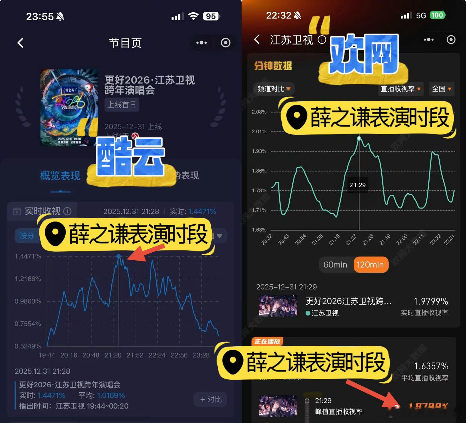 薛之谦江苏卫视跨年收视率最高 昨晚的跨年大战,数据出来了!薛之谦在江苏卫视的连唱舞台,拿下了全场收视率的第一名。根据欢网大数据,他演唱的《丑八怪+怪咖+意外》等歌曲串烧,是当晚换台率最低、观众黏性最强的节目。这再次证明了实力唱将的舞台号召力。