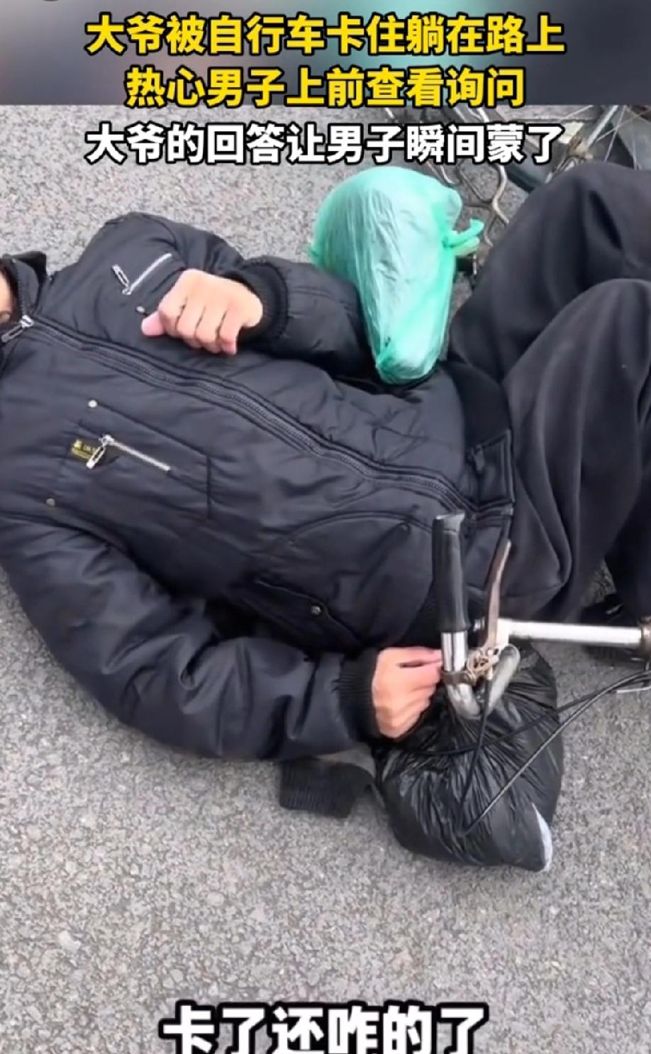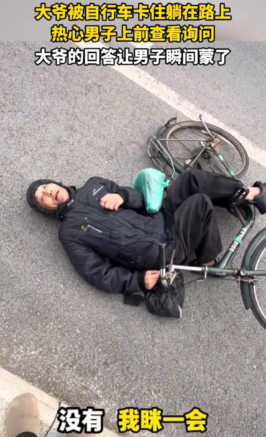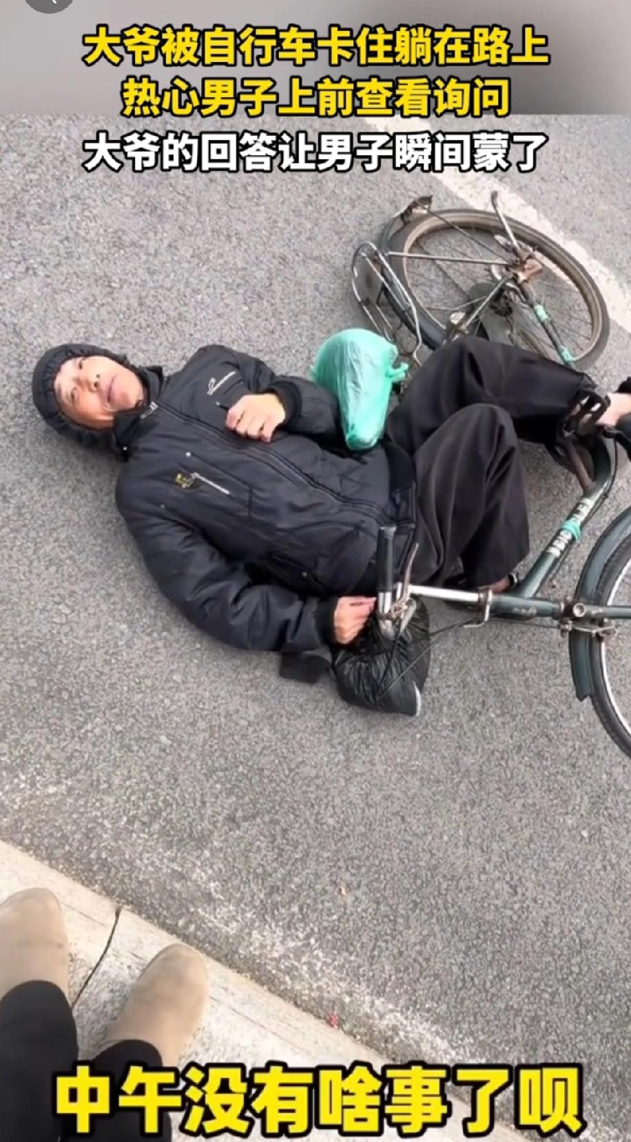 天哪!真是要面子的东北大爷啊! 一大爷被自行车卡住躺在路上,热心男子上前查看询问情况,大爷的回答让男子蒙了。 大爷笑了笑,“没有,我眯一会。” 男子以为自己听错了,再次确认“那你这在这眯一会啥意思啊?” “中午没有啥事了呗。”这摔倒姿势,自行车卡着,大中午马路上躺着晒太阳呢! 这是哪里跌倒就哪里眯一会。估计是摔懵了,自己都不知道自己在干嘛了。 真是要面子的大爷!都这样了还装没事。但是大爷,你这姿势挺吓人了!要不回家继续眯?