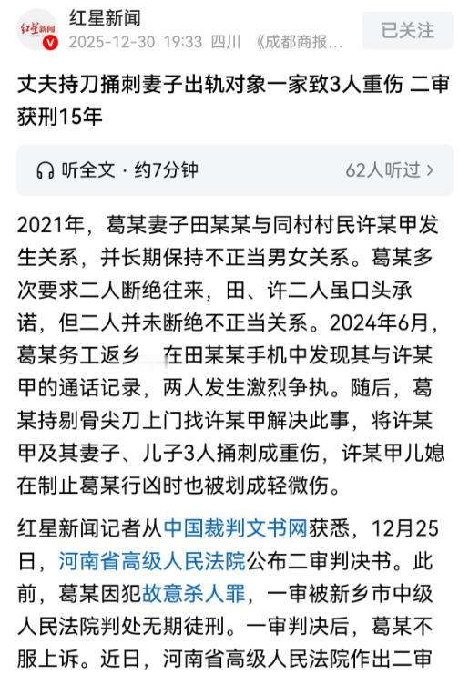 “太冲动了!”12月30日报道,河南新乡,男子发现妻子和同村村民长期保持不正当男女关系,他找到妻子情人,对方承诺跟男人妻子断绝来往。可男子从外地务工回家,发现妻子和情人的通话记录,怒从心起,找到妻子情人家,将妻子情人、对方妻子及其儿子刺成重伤,一审法院判决男子无期徒刑,男子不服,二审有了不同看法。 2016年,葛某(化名)的妻子田某某(化名)和同村的许某甲(化名)因为一起养羊来往频繁,一开始只是普通接触,时间一长,关系就变了味,到2021年,两人正式越过了夫妻之外的底线,开始长期保持不正当男女关系。 2023年2月,葛某通过自家羊圈附近的监控,亲眼看到妻子和许某甲举止亲密,当场炸了锅,立刻找两人对质,面对质问,田某某和许某甲都信誓旦旦地保证,说以后绝对不再联系,葛某当时选择相信,事情暂时压了下去。 为了挣钱养家,葛某之后还是继续外出打工,把家里的事先放一边,可他没想到,所谓的“断绝往来”只是敷衍。 2024年6月初,他打工回到家,在妻子的手机里再次看到了她和许某甲的通话记录,之前的承诺全都成了空话,两口子当即爆发激烈争吵,矛盾彻底失控。 6月18日晚上 8 点多,葛某越想越气,情绪完全压不住,揣上一把剔骨尖刀,骑着电动车直奔许某甲家,他当时心里已经下了狠念头,如果对方态度不好,就干脆下死手。 那天晚上,许某甲家里人不少,妻子马某(化名)、儿子许某乙(化名)、儿媳王某(化名)都在,马某把正在厨房忙活的许某甲叫了出来,两人刚一见面,说了没几句就吵了起来,话越说越难听,情绪彻底失控的葛某突然掏出刀,直接朝许某甲腹部捅了过去。 马某和儿子许某乙见状赶紧上前拦人,想把葛某拉开,可葛某已经红了眼,根本停不下来,又连续朝两人腹部捅刺,儿媳王某一边报警,一边冲上来试图阻止。 混乱中,许某甲拿起铁锨反抗,想把人逼退,结果被葛某用另一把铁锨打掉,还被拍倒在地,接着又挨了几刀,许某甲后来往外跑,顺手抄起叉子防身,也被葛某夺走,追着又捅了好几下。 王某当场跪在地上苦苦哀求,邻居和许某甲的亲属也陆续赶到劝阻,这才把他拦住,随后,葛某没有逃跑,而是坐在许某甲家门口,等着民警赶来。 事后鉴定结果相当严重。许某甲肠管受损、腹腔积血,构成重伤二级,还留下两处十级伤残,马某的胃、脾、胰、左肾都被捅伤,同样是重伤二级,腹部损伤评为七级伤残,许某乙腹腔积血、肠道破裂,也是重伤二级,腹部九级伤残,儿媳王某右手被划伤,属于轻微伤。 法院一审认定,葛某主观上具有杀人故意,行为性质极其恶劣,构成故意杀人罪,后果严重,判处无期徒刑,剥夺政治权利终身,同时判决他赔偿四名被害人二十多万元医疗等费用,这个结果出来后,葛某不服,被害人一方同样不满意,双方都提起了上诉。 到了2025年12月25日,河南省高级人民法院公布了二审结果,判决被改为有期徒刑十五年,法院解释改判的理由主要有几方面:一是许某甲长期与葛某妻子保持不正当关系,对案件的发生有明显过错,二是葛某作案后没有逃离现场,到案后如实交代了全部事实,依法认定为自首,三是在二审期间,葛某及其家属积极赔偿被害人的经济损失,并取得了对方的谅解,这些都属于法定、酌定的从轻处罚情节。 判决一公布,网上立刻炸开了锅,有人觉得,许某甲破坏别人家庭在先,葛某是被一步步逼到崩溃,十五年已经不轻了,比无期合理,也有人坚决反对,认为不管感情纠纷多大,都不能持刀伤人,更何况是把三个人捅成重伤,从无期改成十五年,实在太轻。 还有一些人相对冷静,认为法律既要考虑被害人的过错,也必须对严重暴力行为保持足够的惩戒力度,任何理由都不能为以暴制暴开脱。 说到底,这起案子里没有真正的赢家,葛某因为一时失控,换来十五年的牢狱生活,自己的家庭也彻底毁了,许某甲一念之差,不仅害了自己,还连累家人留下终身伤残,两个原本普通的家庭,因为一段不正当关系和一场失控的暴力,全都掉进了痛苦的深渊。 婚姻遭遇背叛,换谁都难以接受,但解决问题的路并不只有一条,离婚、维权、走法律途径,都是合法的选择。 一旦用暴力发泄情绪,往往只会把事情推向更糟的结局,最终害人也害己。 不管情绪多激烈,都必须守住法律的底线,一次冲动,可能真的要用半辈子甚至一辈子去偿还。 对此你怎么看? 信源:红星新闻