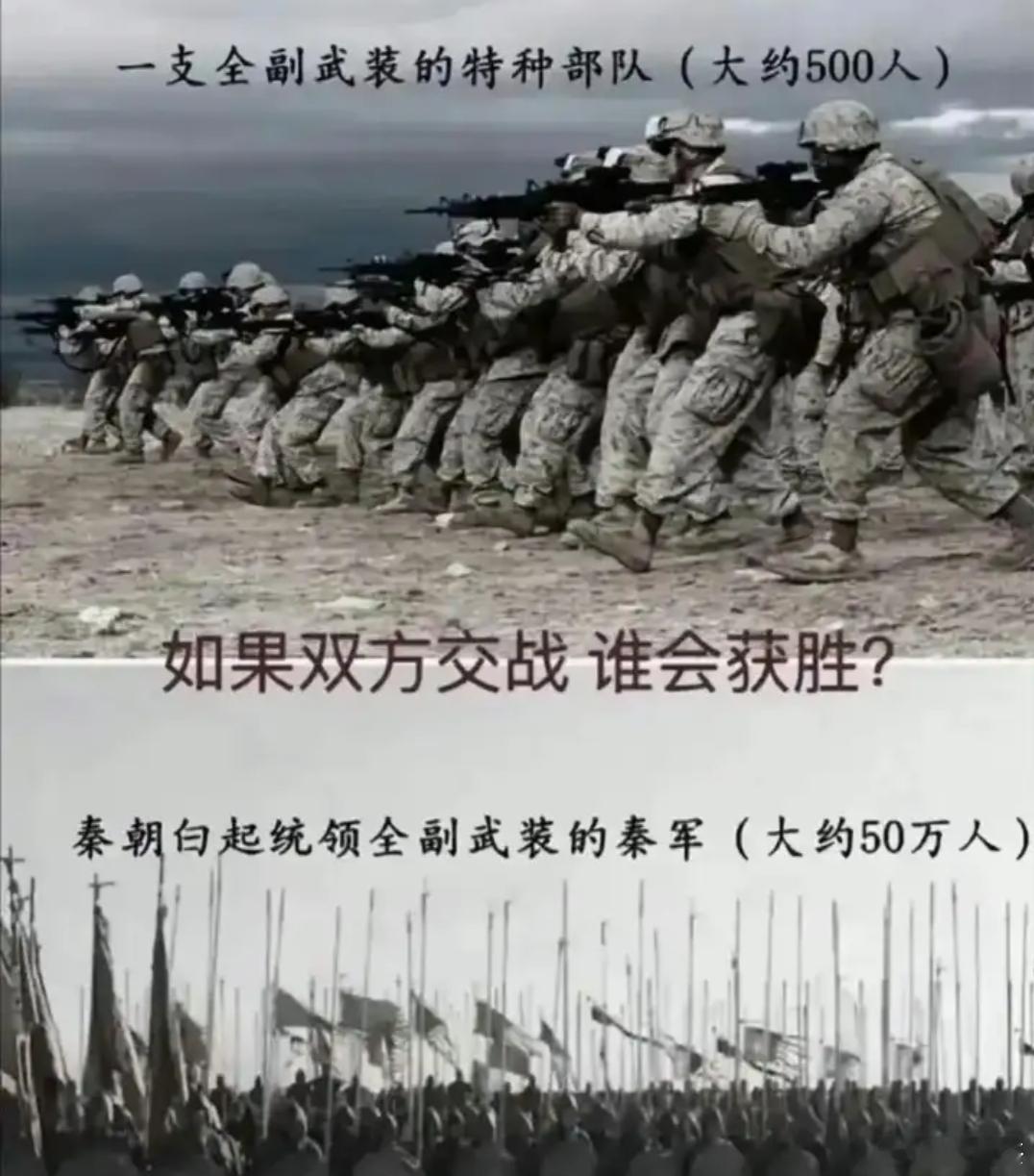 假如一支全副武装的特种部队(大约500人)和秦朝白起统领全副武装的秦军(大约50万人)交战,你们觉得谁会获胜?