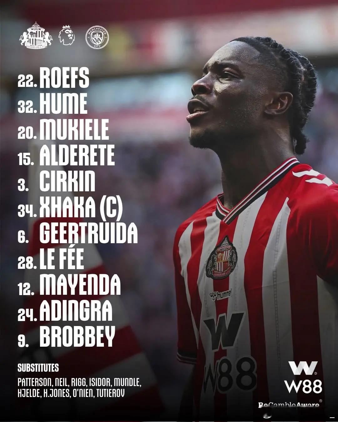 桑德兰首发:22-罗夫斯、20-穆基勒、15-阿德雷特、3-瑟金、32-休姆、6-海特勒伊达、34-扎卡、28-勒费、24-阿迪格拉、12-梅恩达、9-布罗比替补:1-帕特森、33-杰尔德、17-奥尼恩、4-丹-尼尔、31-里格、50-哈里森-琼斯、14-蒙德尔、57-图特洛夫、18-伊西多曼城首发:25-多纳鲁马、27-努内斯、3-鲁本-迪亚斯、6-阿克、33-奥赖利、14-尼科-冈萨雷斯、20-B席、26-萨维尼奥、47-福登、10-谢尔基、9-哈兰德替补:1-特拉福德、4-赖因德斯、11-多库、16-罗德里、24-格瓦迪奥尔、45-胡桑诺夫、63-穆卡萨、82-刘易斯 、92-雷根-赫斯基