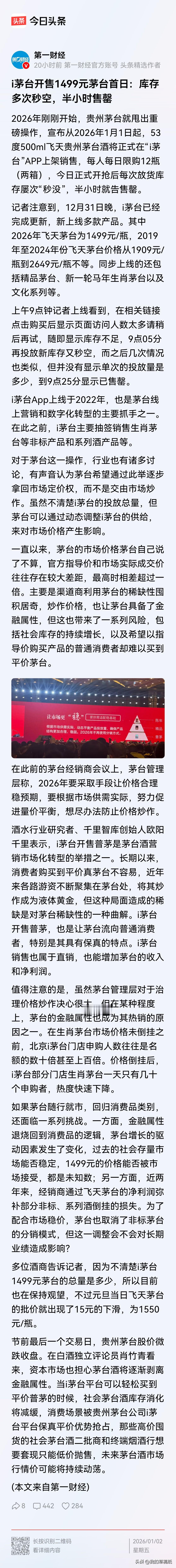 茅台“放大招”,黄牛要哭了!2026年第一天,i茅台正式开卖1499元飞天普茅,每次上架秒空,火爆全网。 这意味着什么?普通人能轻松买到保真平价茅台,消费场景正被官方直接抢占。而那些高价囤货的社会二批商、烟酒行,手里一堆库存突然不香了。消费者何必多花钱买来历不明的酒?茅台这一手“釜底抽薪”,让炒作链条瞬间紧张。 一旦平价供给形成稳定预期,社会库存消化必然放缓。囤货商想套现,只剩“降价抛售”一条路。元旦当天市场批价应声下跌15元,只是开始。未来茅台酒行情价,很可能持续震荡。 茅台这次不只是卖酒,更是要收回定价权、挤掉虚火。金融属性褪去,酒终将回归消费。长远看,这是茅台走向市场健康的必经之痛。但那些还抱着“液体黄金”梦的囤家们,得赶紧醒醒了。 对此你怎么看,欢迎评论区留言分享。 茅台行情 茅台