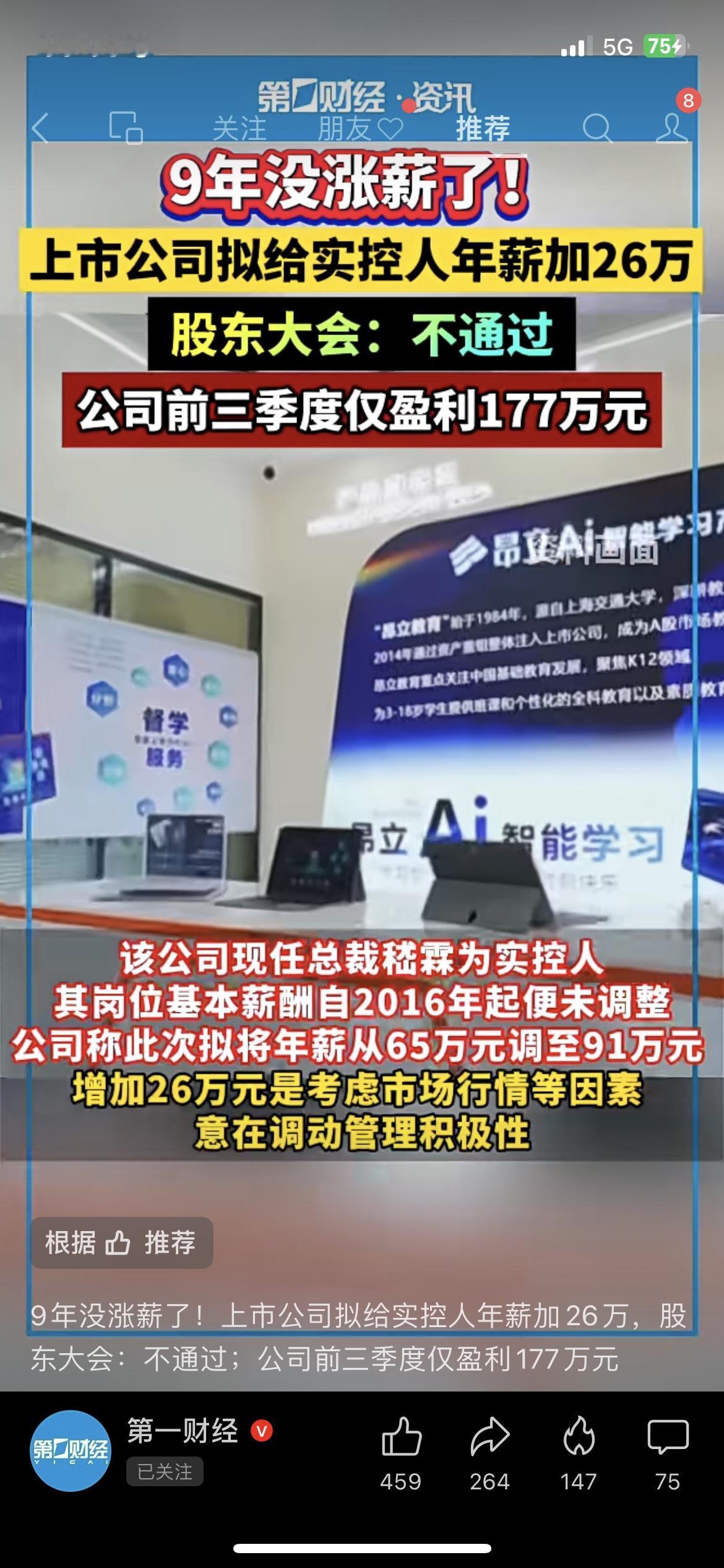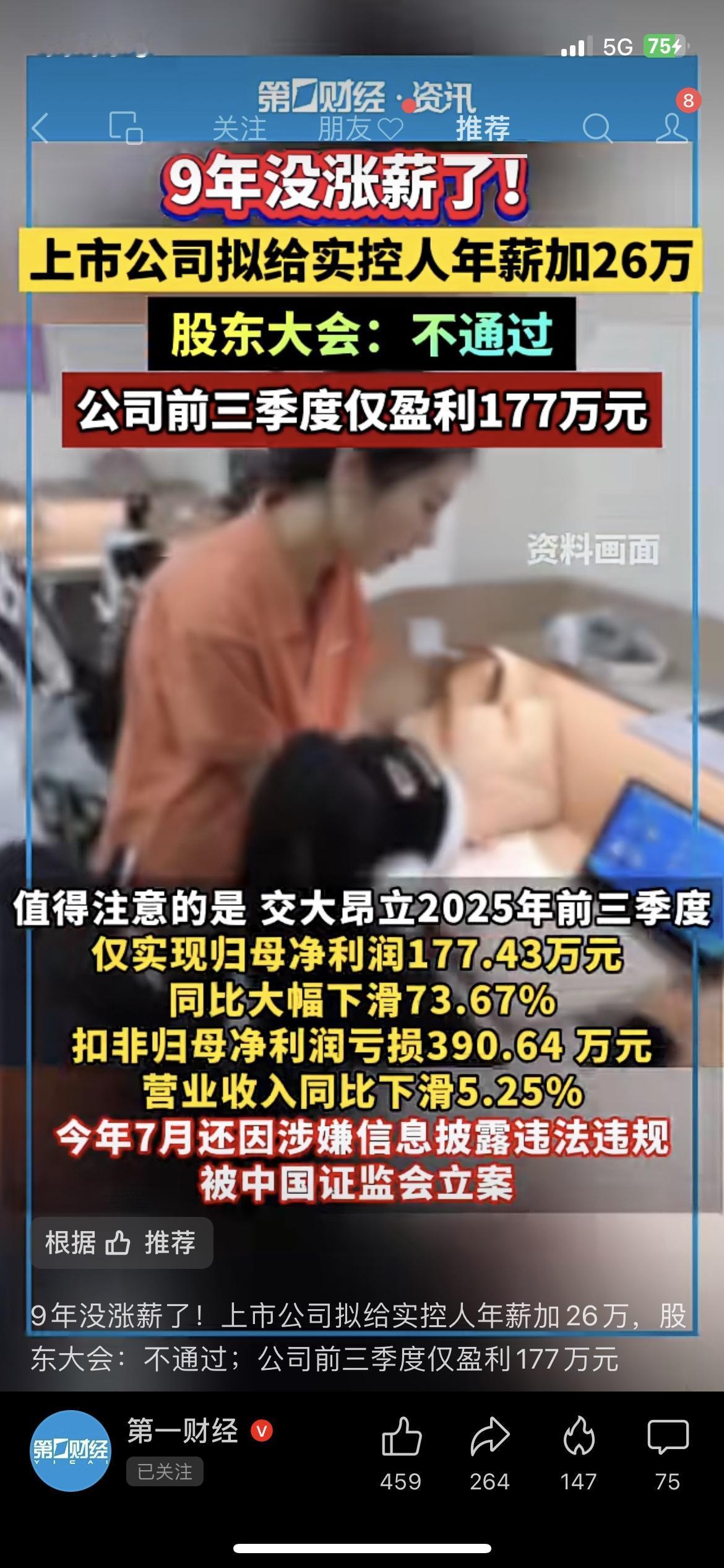 打工人看了都气炸!交大昂立9年没给员工涨薪,却提议给实控人年薪加26万,结果被股东会直接否决。 更离谱的是,公司前三季度仅盈利177万,扣非后还亏损390万,7月还因信披违规被证监会立案。 我同学在类似公司上班,公司盈利差还给高管涨薪,员工薪资多年不涨,这次提案被否太解气! 你所在的公司有过盈利差却给高管涨薪的情况吗?你觉得这种操作合理吗?