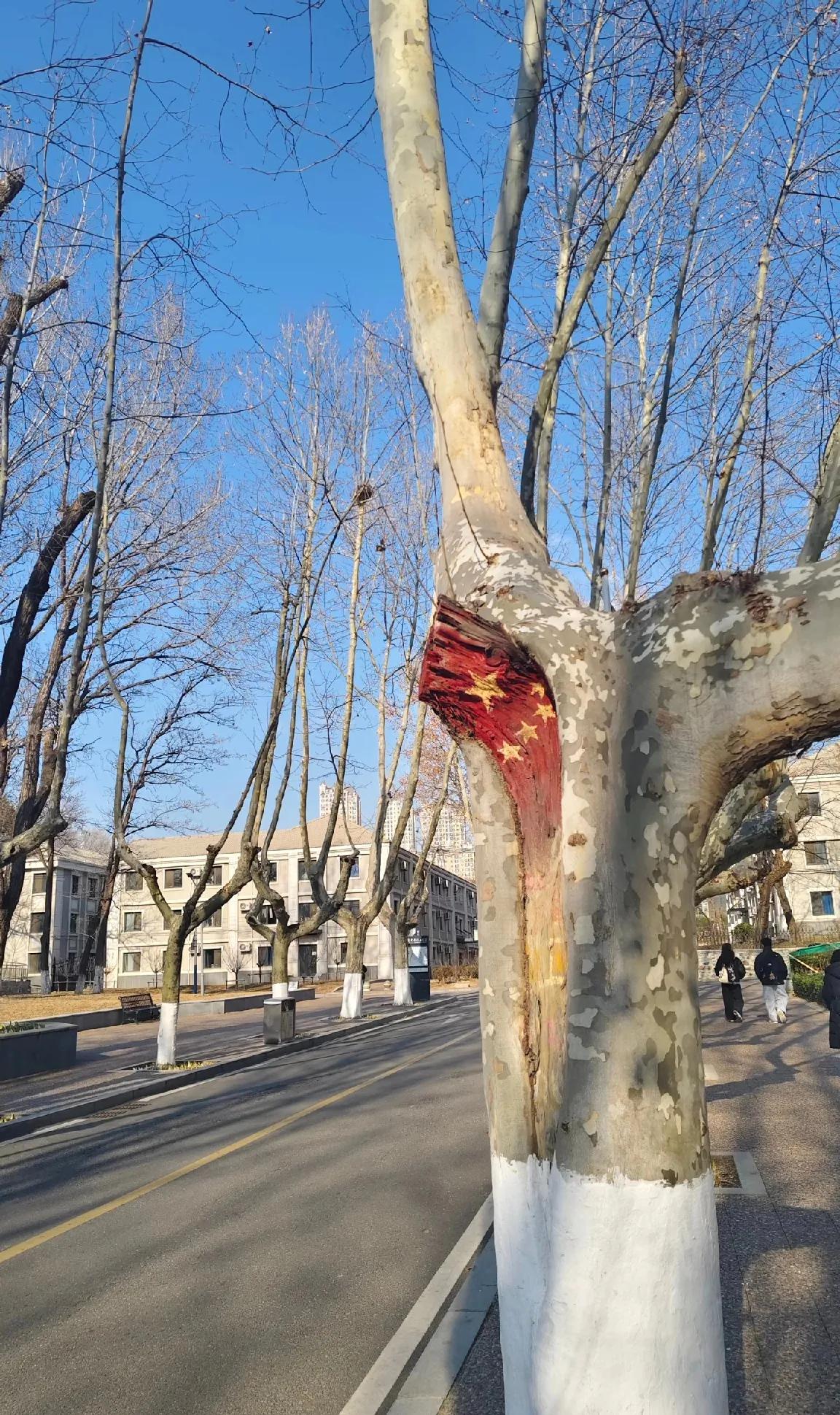 早上走在马路上,不经意抬头一看,见树干被粉刷成了国旗颜色,瞬间心头一热! 树干的纹理粉刷出五星红旗的模样,搭配着湛蓝的天空,真的让人瞬间上头。 有网友说的好,“连树木都藏着爱国的底色,这是刻在骨子里的家国情怀啊。”祖国的五星红旗 红旗招展 树干涂白 剪影五星红旗 树干画画