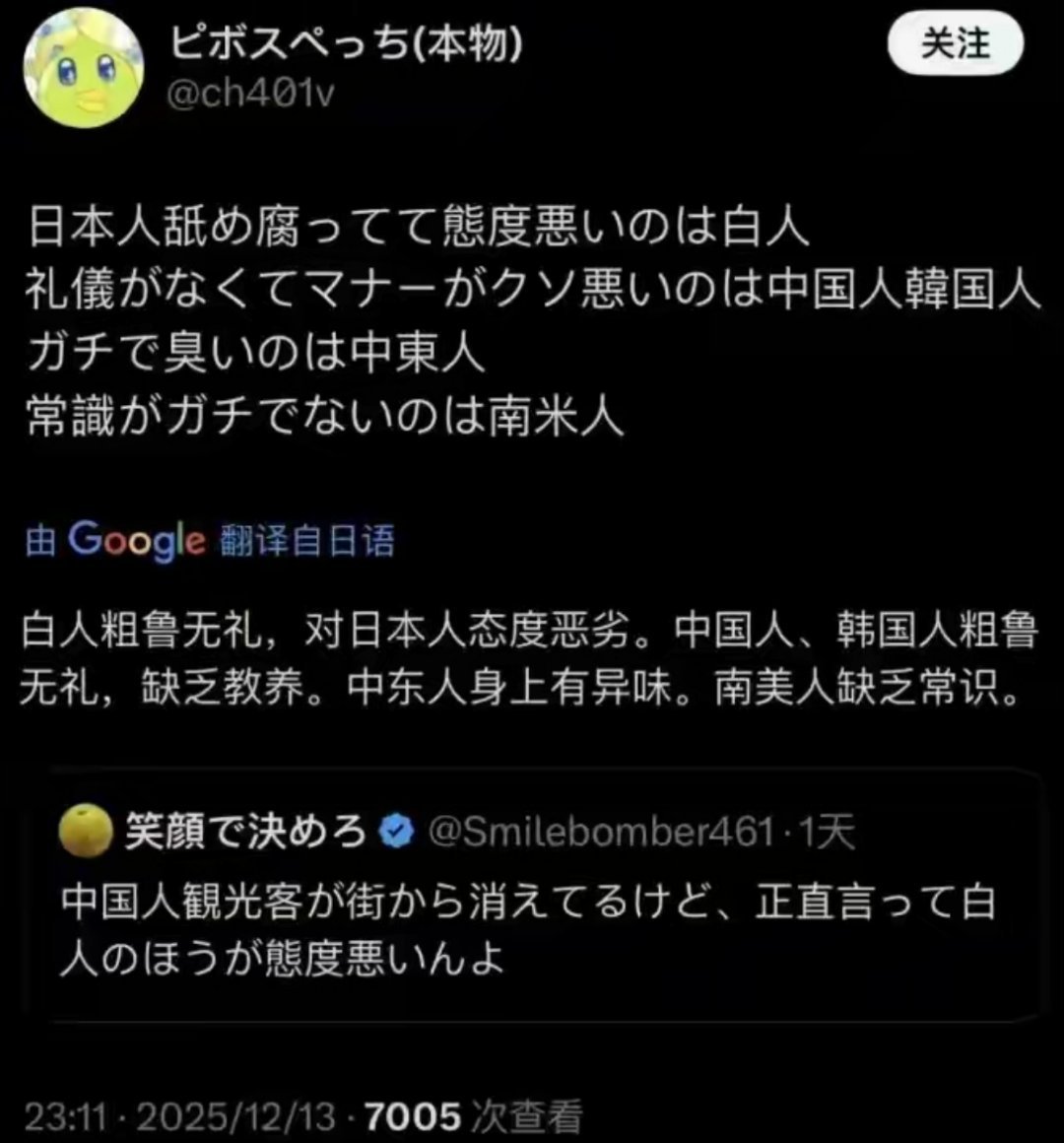 日本网民称:白人粗鲁无礼,对待日本人态度恶劣;中国人韩国人粗鲁无礼、缺乏教养;中东人身上有异味,南美人缺乏常识。咦,好像漏掉了黑人?