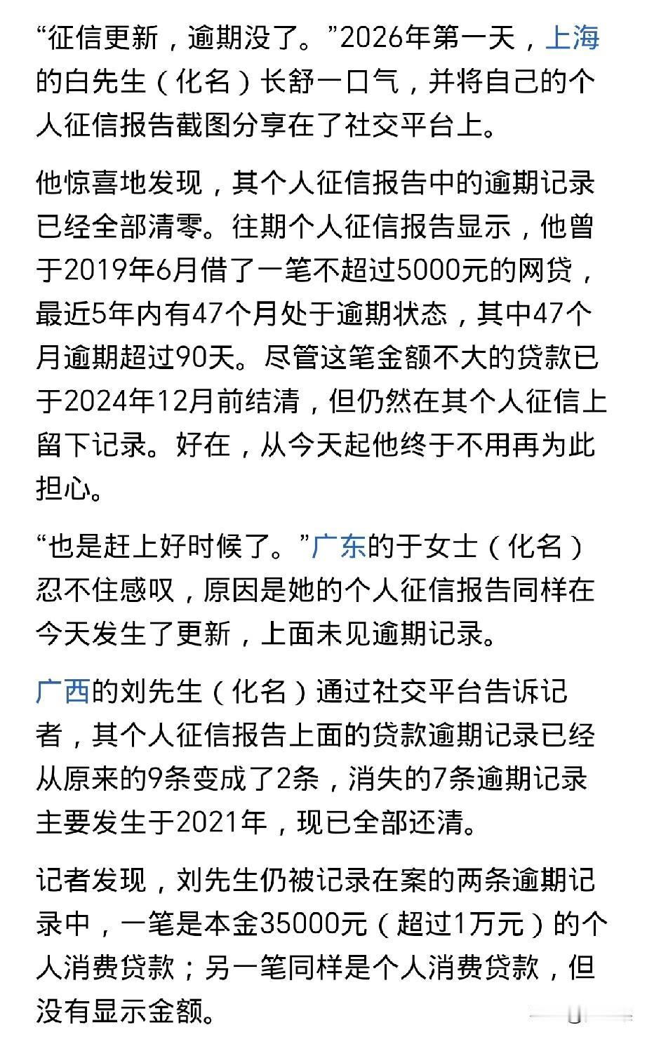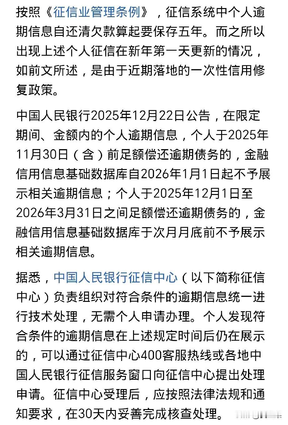 个人逾期清零了, 新年第一天就有了这么个好消息, 以前因为逾期信息要保存五年, 这五年里不管还没还,都有记录, 但是从2026年起,只要你还了,就可以清零。 你也可以个人申请,只需要打个电话就行。 这对个人征信有很大帮助,有逾期信息对贷款很不友好,没有了逾期信息,再使用资金也方便了许多。