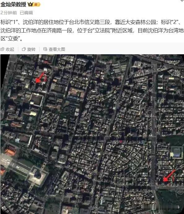 哎哟哎哟,大家看看金教授亲自下场。 直接把台独死硬分子沈伯洋的住宅,还有工作地址给曝光了。 这名大陆的通缉犯,一般就在这两个地方出没。 岛上的勇士们,还不赶紧抓他请赏啊。 只要抓住了他,将来就是大功一件。 有前科的可以算你起义。 没前科的算你直接立功。 气氛都烘托到这个份上了,还不动手,那你们可真没救了。 最后提醒一句。 住在这个通缉犯周边的台湾老百姓们还是要小心一点。 将来定点斩杀的时候,别把您家的花花草草给炸了呀。