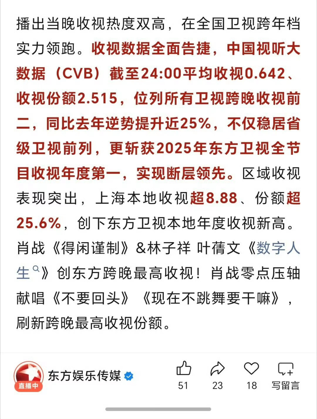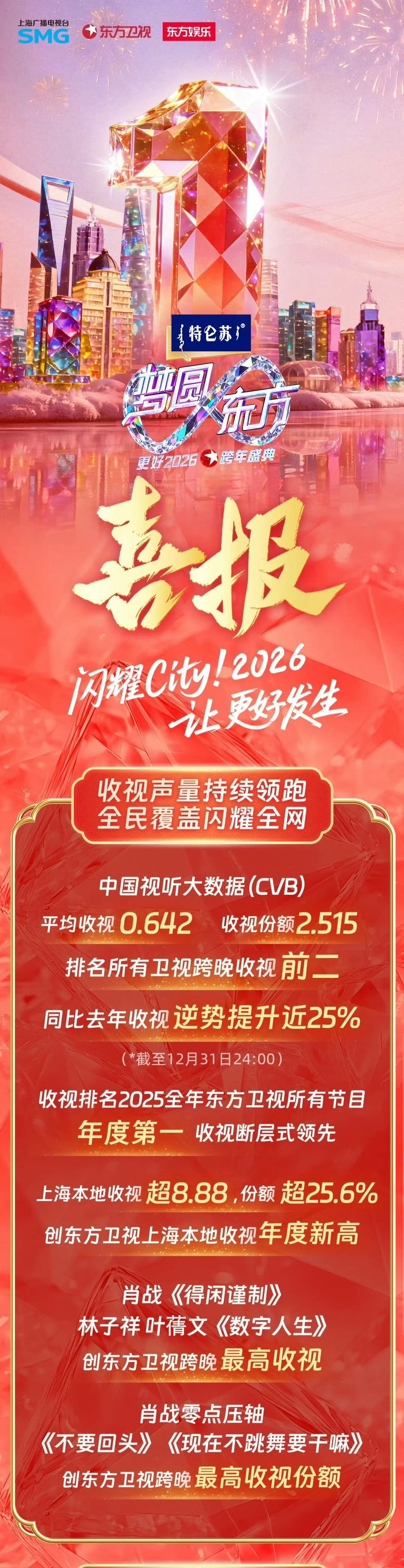 东方卫视跨年收视率(cvb)位列所有卫视前二,比去年同比逆势提升25%,斩获东方卫视全年断层第一,肖战《得闲谨制》和林子祥叶倩文《数字人生》创最高收视率,肖战零点压轴刷新跨晚最高收视份额,肖战收视福星。