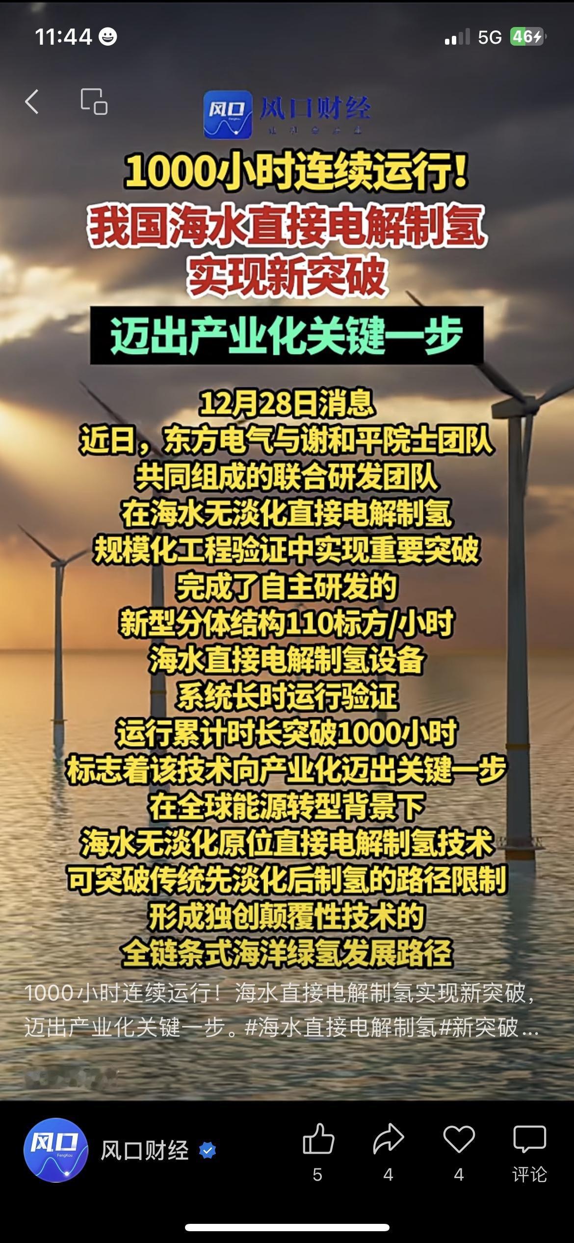 我国制氢技术再突破!海水直接电解制氢能稳跑千小时新能源 大连的张教授,盯着实验室的监测数据,看到设备满千小时运行,激动地直点头。 东方电气联合院士团队,攻克海水直接电解制氢技术,不用淡化海水就能产氢。 还搭建了完整的海洋绿氢发展路径,朝着产业化落地又迈了一大步。 这技术突破,给新能源赛道添了十足底气。 你觉得海水制氢技术能带动哪些行业发展? 未来绿氢能普及到哪些生活场景里? 海水制氢