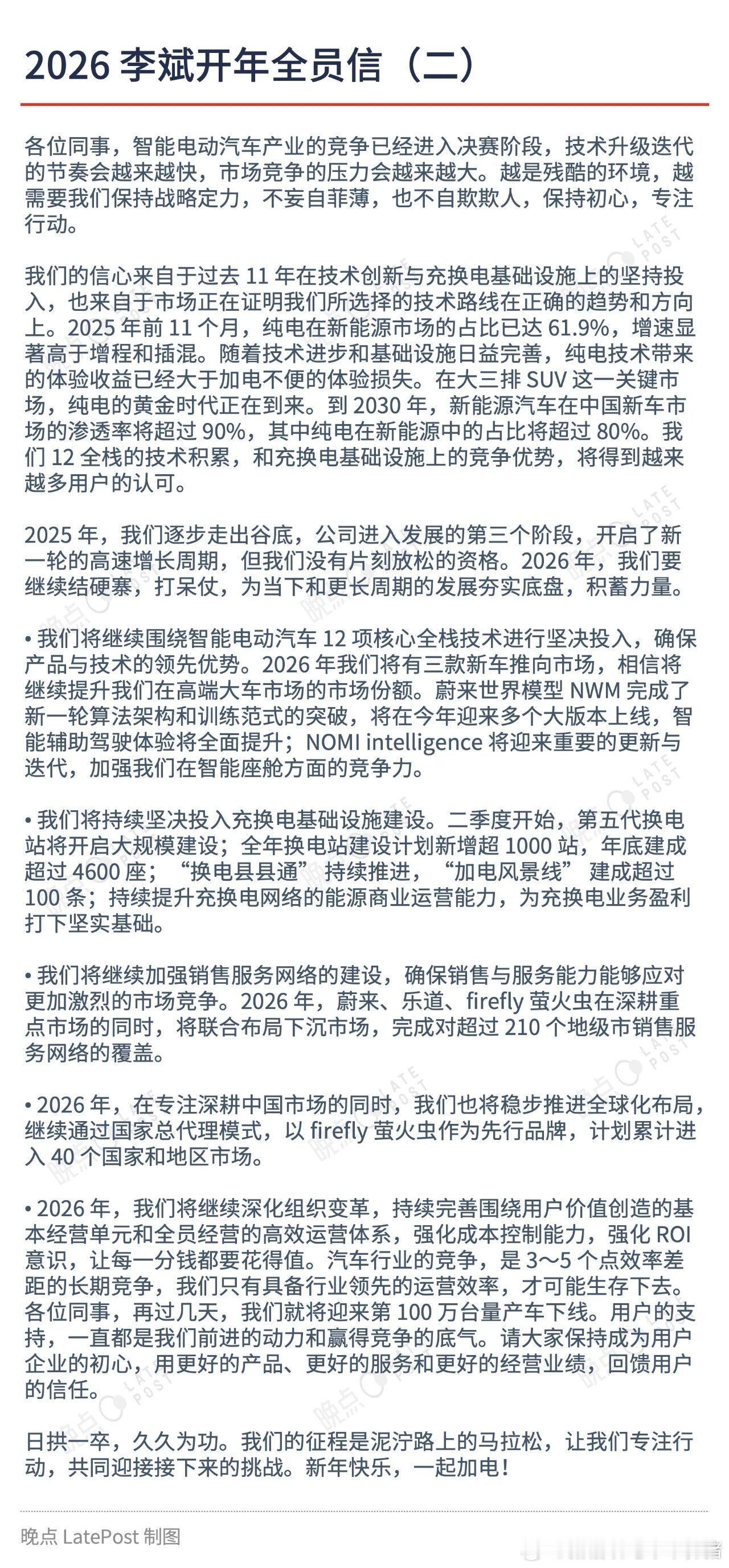 李斌2026开年全员信:蔚来重回增长,纯电未来可期2025年,蔚来迎来强势收官!12月交付新车48135台,创历史新高;全年三品牌协同发力,总交付同比增长46.9%。乐道L90、蔚来ES8引领大三排SUV纯电化浪潮,萤火虫品牌市占率持续领跑。这背后,是蔚来11年技术深耕的厚积薄发:自研5nm智驾芯片、全域操作系统、天行底盘等核心技术全面落地,3737座换电站织就“加电比加油更方便”的网络。2026年,蔚来计划新增超1000座换电站,推出三款新车,深化全球化布局。智能电动决赛圈,蔚来以长期主义踏浪而行。致敬每一份坚持,期待下一程光芒!加电⚡蔚来李斌蔚来换电去哪都方便大v聊车