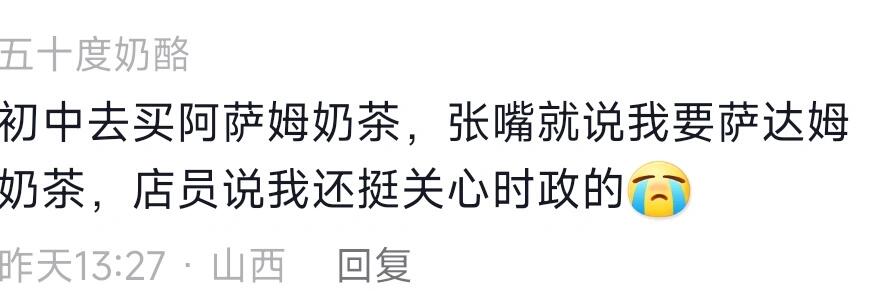 初中去买阿萨姆奶茶,张嘴就说我要萨达姆奶茶,店员说我还挺关心时政的