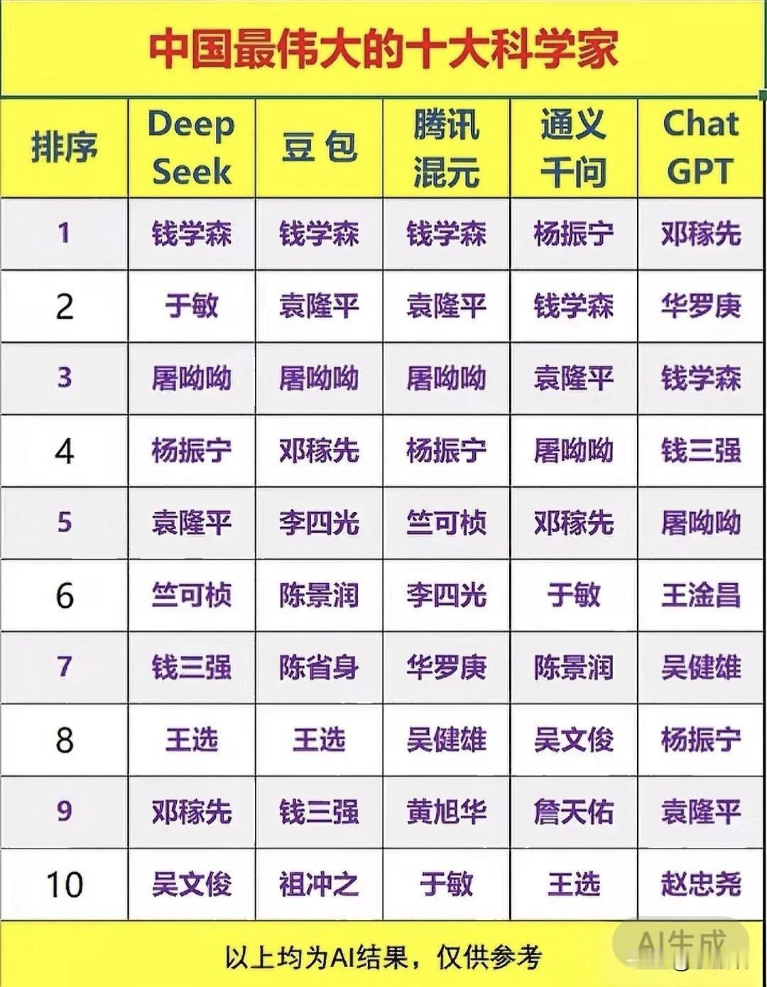 不同AI对“中国最伟大的十大科学家”给出的榜单差异不小,有排序不同,也有入选人物名单的区别。科学贡献难用名次衡量,可这类分歧榜单,哪一份契合你的评判呢?