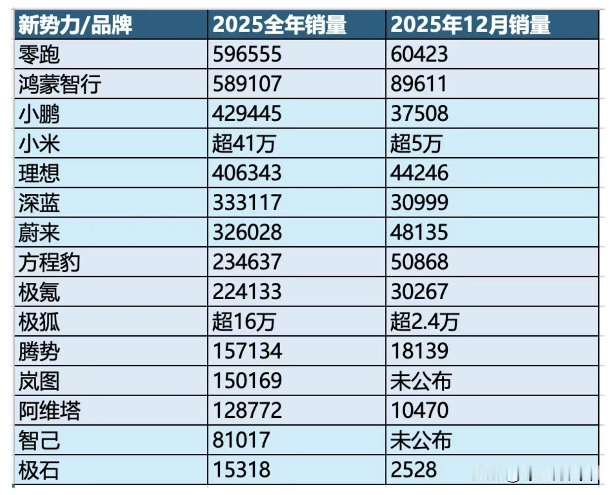 新势力分化四大阵营!零跑/鸿蒙第一,小鹏/小米/蔚来/理想/深蓝第二 零跑年销近60万辆,真成新势力的“领跑者”;小鹏汽车年销43万辆,反超理想和蔚来;鸿蒙智行年销59万辆,小米汽车年销41+万辆,华为与小米两大手机品牌虽入局晚,但两家合计年销已超百万辆。 2025年销量数据显示,中国新能源汽车市场的竞争格局,已呈现清晰的四级梯队分化态势。头部阵营分化加剧,中坚力量奋力追赶,而技术路径、产品矩阵与品牌定位的差异,正成为决定下一阶段排位的关键变量。 随着智能驾驶普及、增程/纯电路径融合、高端化与平民化市场多方面挤压,2026年的竞争将更聚焦于技术纵深(含智驾平台)、品牌韧性(与高端化)、生态协同(与自研自制)与全球化视野(出口)。那些既能规模化落地,又能持续构建技术护城河的企业,方能在下一轮行业洗牌中赢得主动权!大家觉得呢?[灵光一闪]