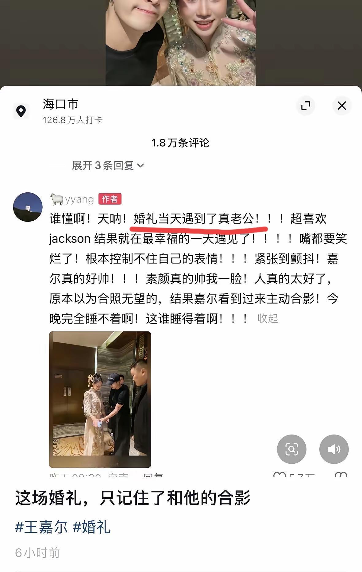追星可以,但追到连真老公是谁都分不清了……,那就有点恐怖了[尬笑]…… 某女郎结婚时恰好遇到心水爱豆王嘉尔,跟王嘉尔合照,然后声称遇到“真老公”王嘉尔…… 王嘉尔是锅从天降 她新婚老公是帽从天降,虽然是“虚”帽,但新娘子心里另外有人(爱豆王嘉尔)那是真的[可爱][狗头]