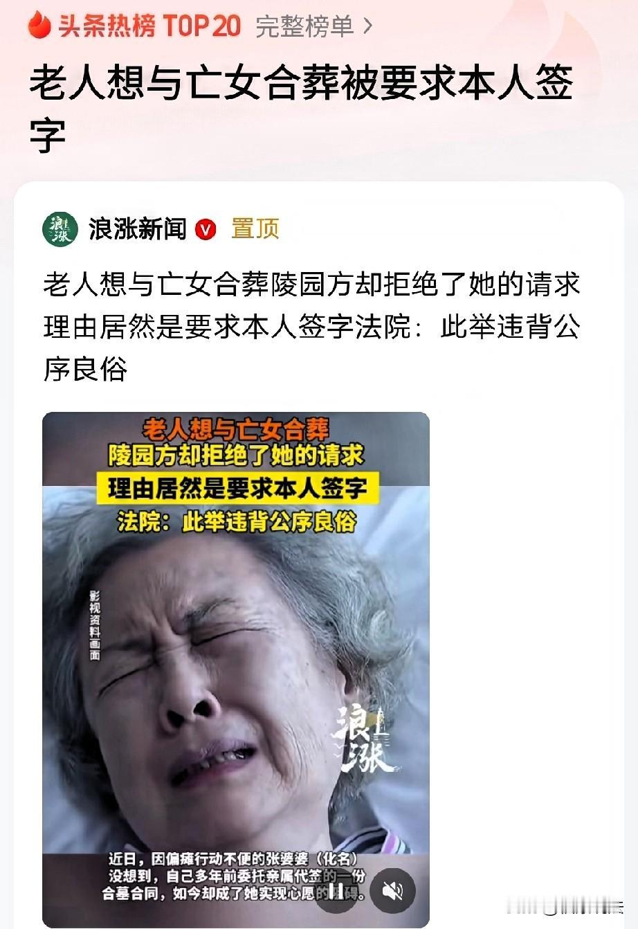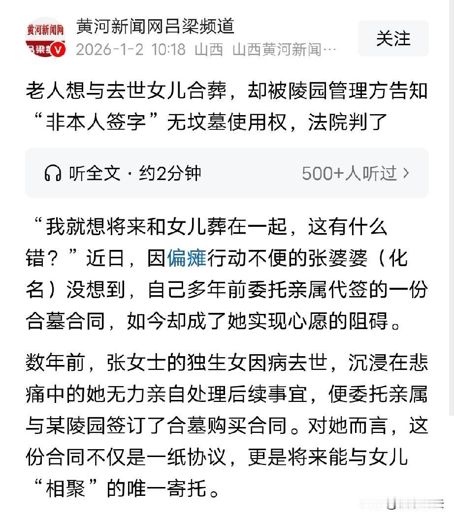“按章办事?”老太偏瘫行动不便,想百年后和逝去女儿合葬,便提前去陵园办理合墓使用权确认手续,却遭拒绝,陵园方说:合同不是老太本人签字,必须要原经办人亲自来变更手续。老太为难了,原经办人不愿配合,她只能拿出购买墓地的转账记录,可陵园就是不同意,眼看不能和自己女儿合葬,老太只好告上法院,法院作出公正判决。 张老太年纪大了,身体因偏瘫行动不便,她开始提前安排身后事,于是,她拖着病躯找到陵园,想着先把合墓使用权确认手续办了,这样她心里才踏实。 可是,当她说出自己的要求时,陵园却拒绝了她的请求。 陵园也是有理由的,这份合同上签字的人不是张老太本人,无法给她办理,必须得是原经办人亲自来办理变更手续,这是规定。 面对这当头一棒,张老太为难了,她只有这一个心愿了,怎么这么难办呢?! 原来,在多年前,张老太唯一的女儿生了病,永远的离开了她。 那时候,张老太白发人送黑发人,眼泪都哭干了,根本没办亲自给女儿处理后事,所以,那时她委托亲属帮忙去某陵园签订了一份合墓购买合同。 那时候,张老太就已经想好了,如果自己百年那天,她要和女儿葬在一起,这是她最大的心愿,也是唯一的寄托。 然而,当张老太面对陵园拒绝的理由时,也是愁眉不展,因为她家里关系出了变故,原经办人说什么都不愿意出面办理变更手续。 张老太只好拿出当年支付购买墓地的转账记录,一遍一遍的跟陵园工作人员解释当时委托代签的背景情况,希望对方可以通融通融。 可是,陵园方说啥不让步,坚持按照规定办事,愣是没有同意张老太的请求。 张老太和陵园沟通了很多次,都没有效果,她走投无路,为了达成自己的心愿,她一纸诉状将陵园告上法院。 有人说,老人也想不开,合葬后,没有后人了,谁给扫墓?20年后谁给交墓穴使用费?其实吧老人就是一精神寄托,按说陵园方应该满足。 不过,也有人说,陵园的规定是资本的趋利体现,若老人不能与其女儿合葬,老人就得再买一墓地,陵园方又多赚一次钱。这就是陵园规定的本质所在。 园方推三阻四,目的是想不让其人达到原先的愿望,重新在购买一个墓穴,增加收入吧? 这件事的矛盾点在于,是合同签订人和老太纠纷,老太要合葬,合同签订者不配合,如果陵园方自行同意老太和女儿合葬,容易被合同签订者起诉,所以只能通过打官司解决,陵园才懒得管要埋谁,交钱了埋谁都是埋,他是因为墓地权利人之间有矛盾才这样。 其实,陵园也不是为难张老太,将来如果那个签字的经办人跳出来找陵园麻烦的话,陵园就可以用法院判决免责,毕竟做法是违反规定的。 本来就是个小事,作为亲属的经办人都不愿意出面,陵园肯定觉得买方难缠,走个法院程序,有判决书就不怕以后纠缠了。把麻烦丢给你们省得以后麻烦陵园,人之常情,也是怕了。 本案中,有两个法律问题: 第一,张女士委托亲属与陵园签订的合同有效吗? 《民法典》第161条规定:民事主体可以通过代理人实施民事法律行为。 张女士作为成年人,具备完全民事行为能力,在委托亲属代签合墓购买合同时,她有能力理解合同的内容以及签订合同所带来的权利和义务。 而且,张女士因独生女去世沉浸在悲痛中,且自身无力亲自处理后续事宜,所以委托亲属代签合同,这是她真实意愿的表达。 她希望通过签订这份合同,实现将来与女儿合葬的心愿,这份合同承载着她深厚的情感寄托,不存在被胁迫、欺诈等导致意思表示不真实的情况。 综上,张女士委托亲属与陵园签订的合墓购买合同完全符合法律规定,所以,该合同是合法有效的。 第二,陵园以“合同非本人签字”为由拒绝张女士主张合墓使用权,该行为是否违反法律规定? 《民法典》第143条规定:具备下列条件的民事法律行为有效:(一)行为人具有相应的民事行为能力;(二)意思表示真实;(三)不违反法律、行政法规的强制性规定,不违背公序良俗。 陵园有自己的内部规则,这是其进行管理的一种方式。 但当这些内部规则与法律规定产生冲突时,就必须以法律规定为准。 此事中,陵园以内部规定“非本人签字无坟墓使用权,办理变更业务需原经办人提供相应材料”来限制张女士的合墓使用权。 然而,张女士委托亲属代签合同是合法有效的,她作为合同实质权利人,其权益应受到法律保护。 陵园的内部规则不能成为剥夺张女士合法权益的理由,这种做法违背了公序良俗,也与张老太想与女儿合葬的愿望相悖。 法院在审理时,依据法律规定,认定陵园以内部规则限制张女士权利的行为无效,从而保障了张女士能够依法享有合墓使用权,这也体现了法律高于单位内部规则的原则。 最后,法院判决:确认张老太享有该合墓的使用权。 而陵园也表示,会上门给张老太办理相关手续变更。 此事最终圆满化解。