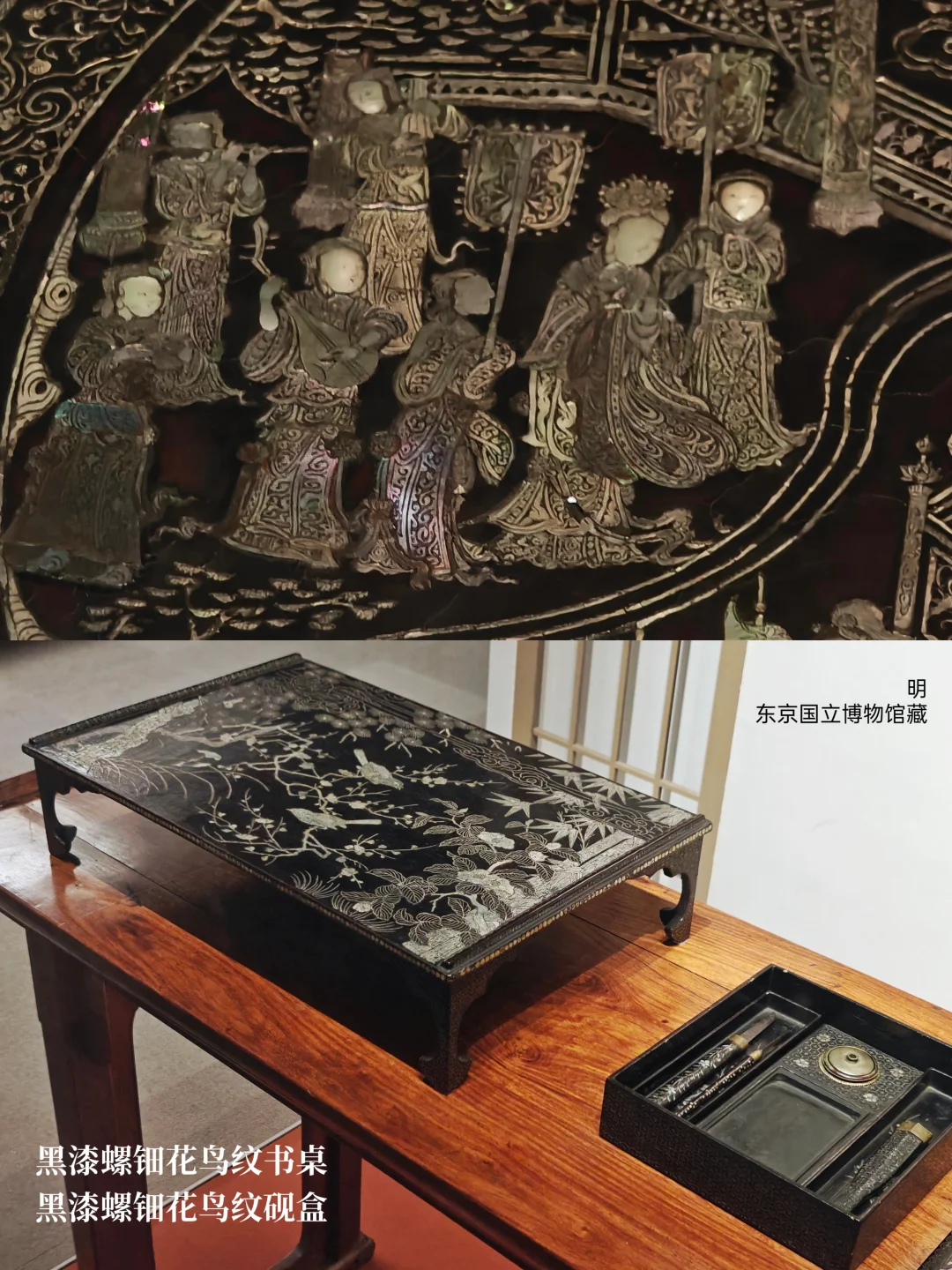 ⚫明 黑漆螺钿花鸟纹砚盒、黑漆螺钿花鸟纹书桌