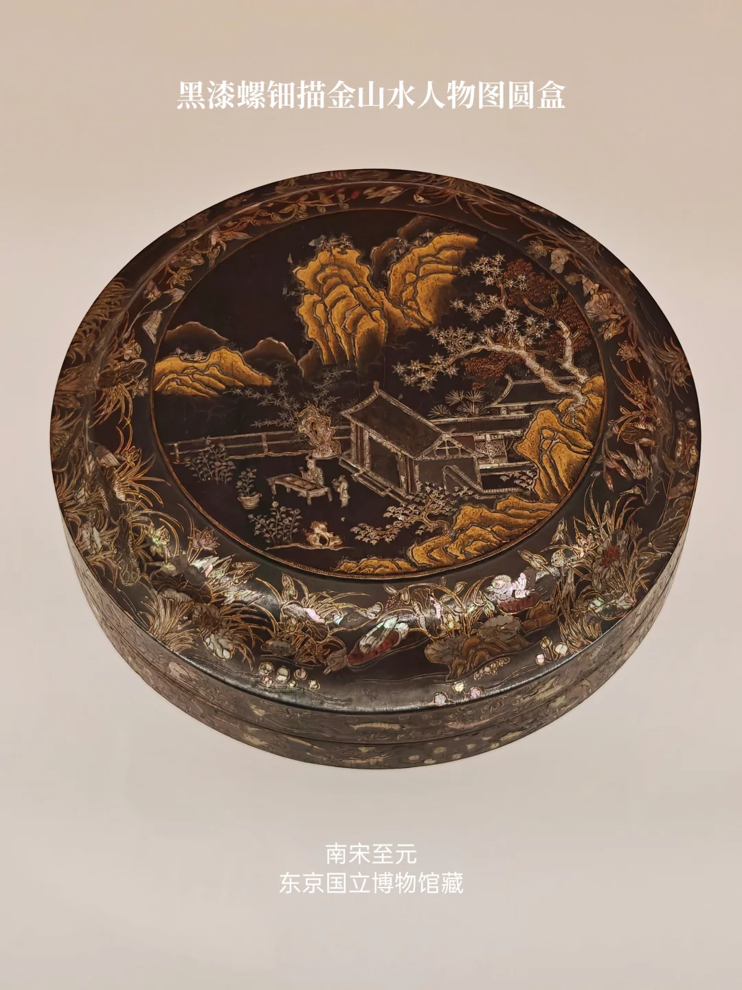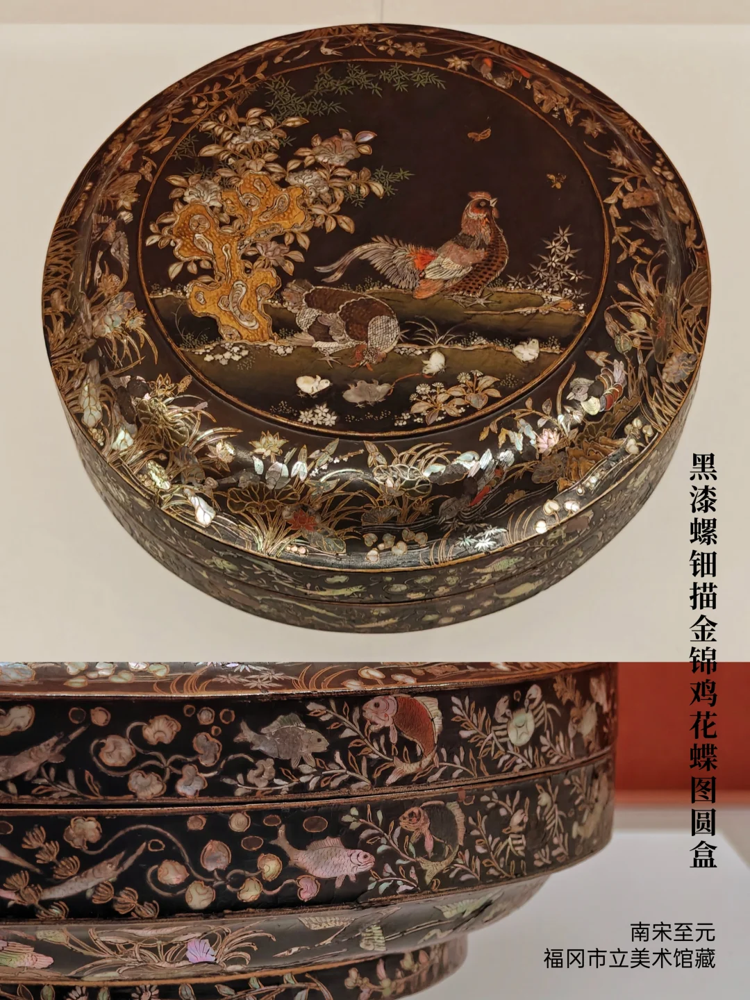 ⚫南宋至元 黑漆螺钿描金锦鸡花蝶图圆盒