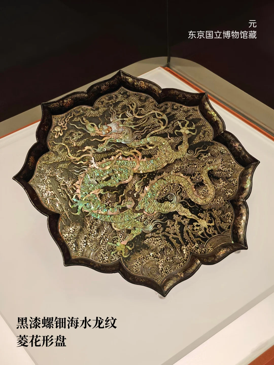 ⚫元 黑漆螺钿海水龙纹菱花形盘