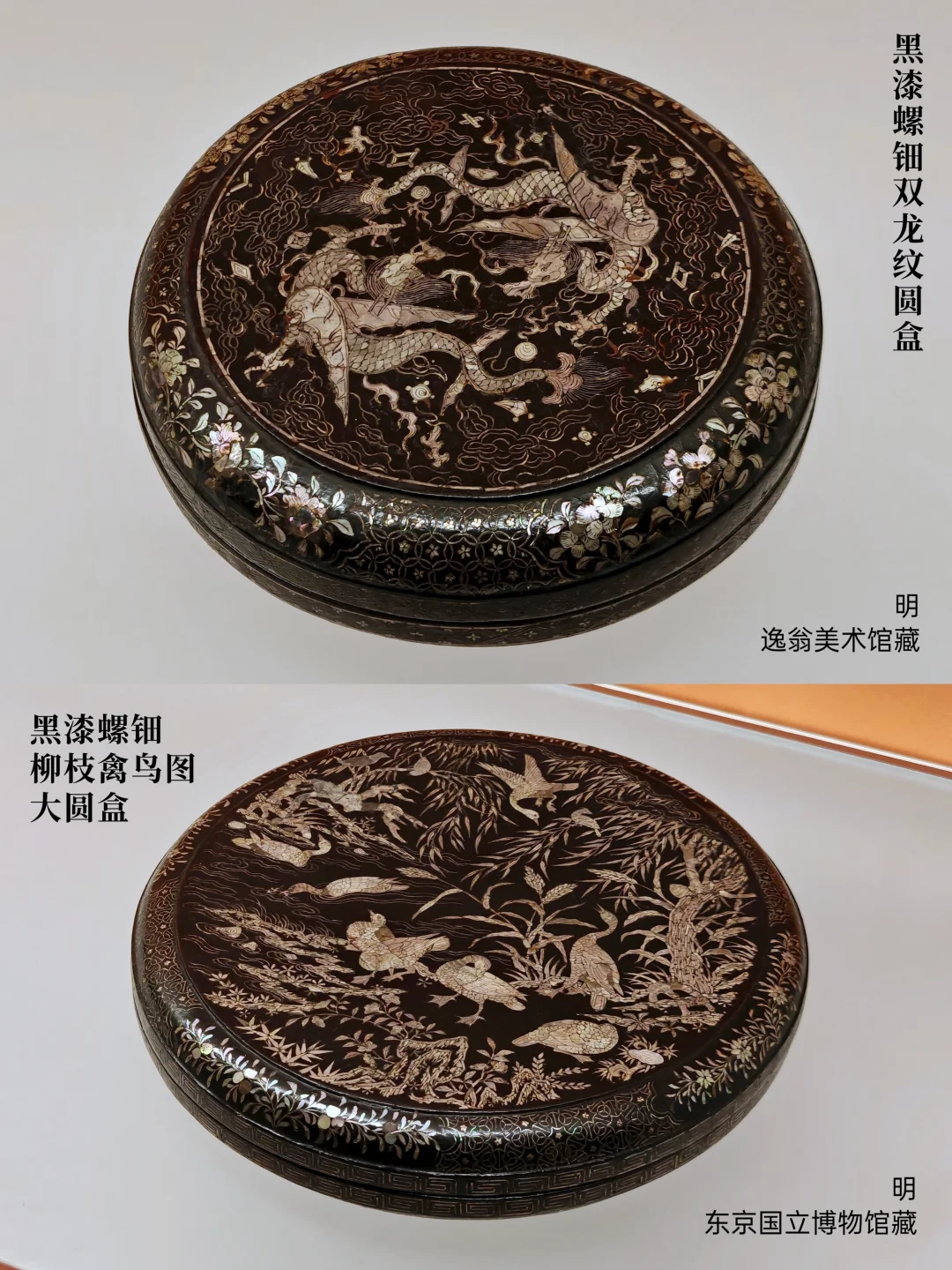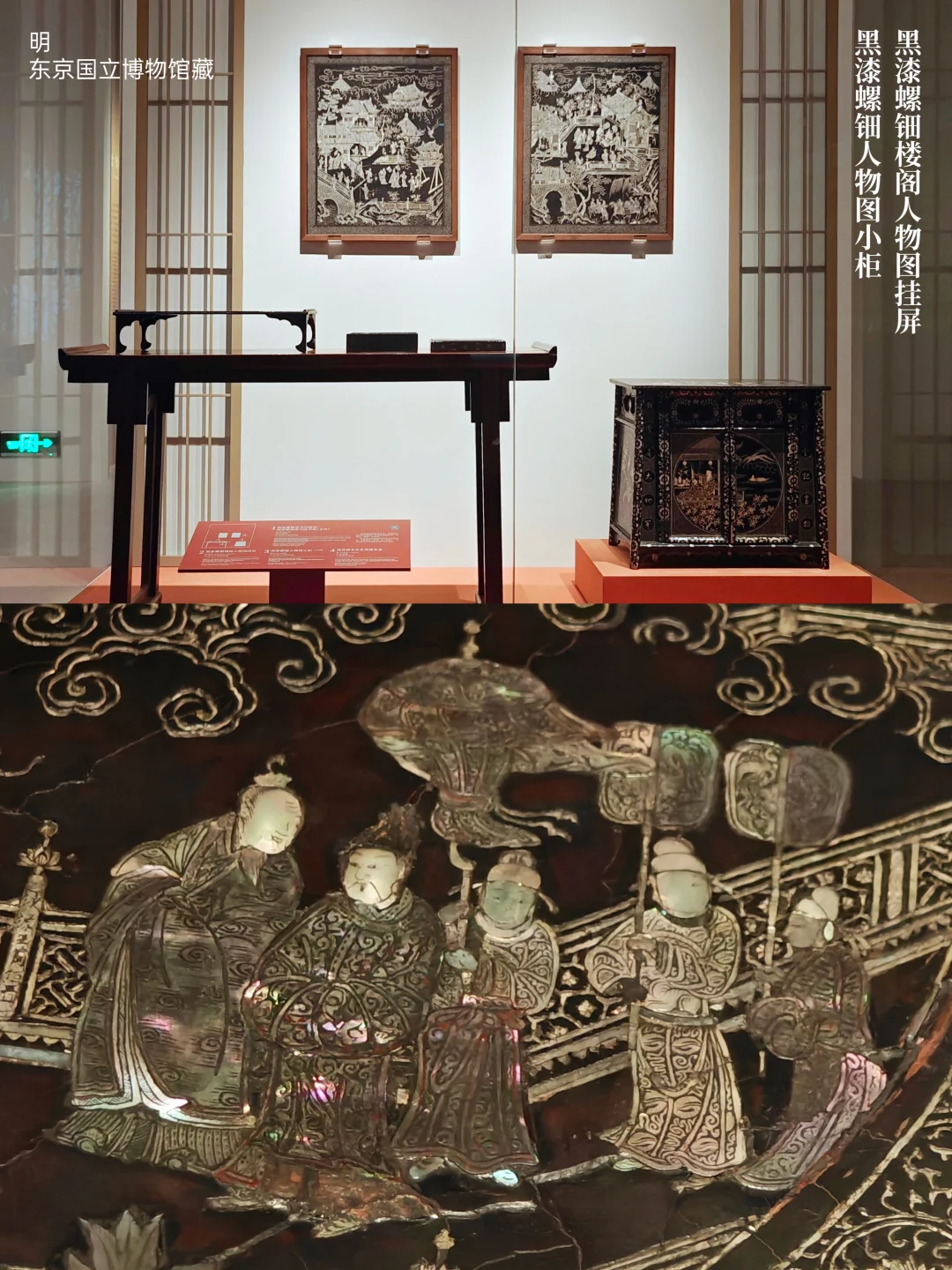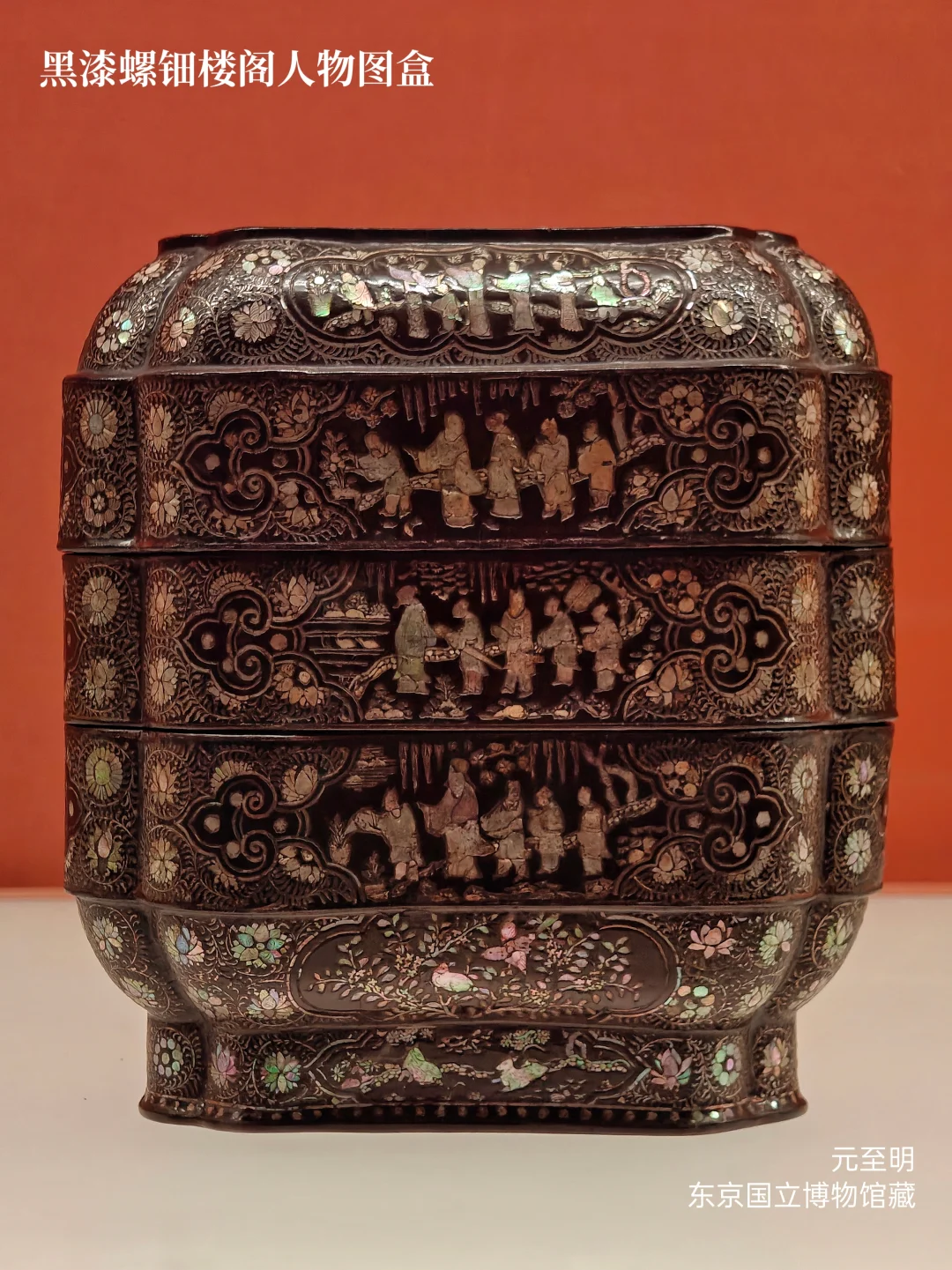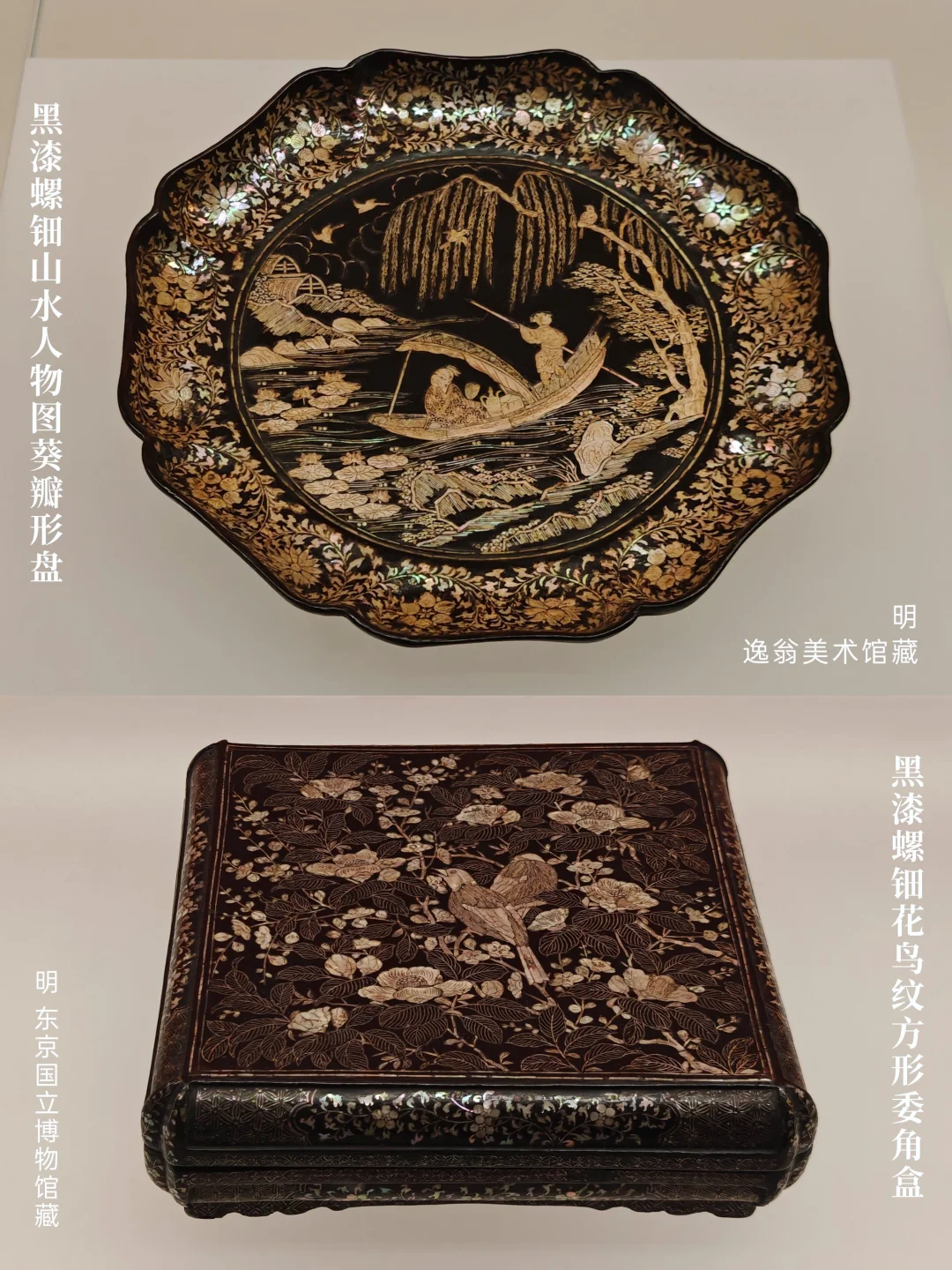 其实剔红剔犀之类的在国内还算看得比较多(清代为主),但这么多上品的螺钿漆器集中在一起展出真的第一次看,本篇全部是螺钿漆器。手机拍摄还是比不上相机,不过参观全程上了虫虫镜,看得很爽!