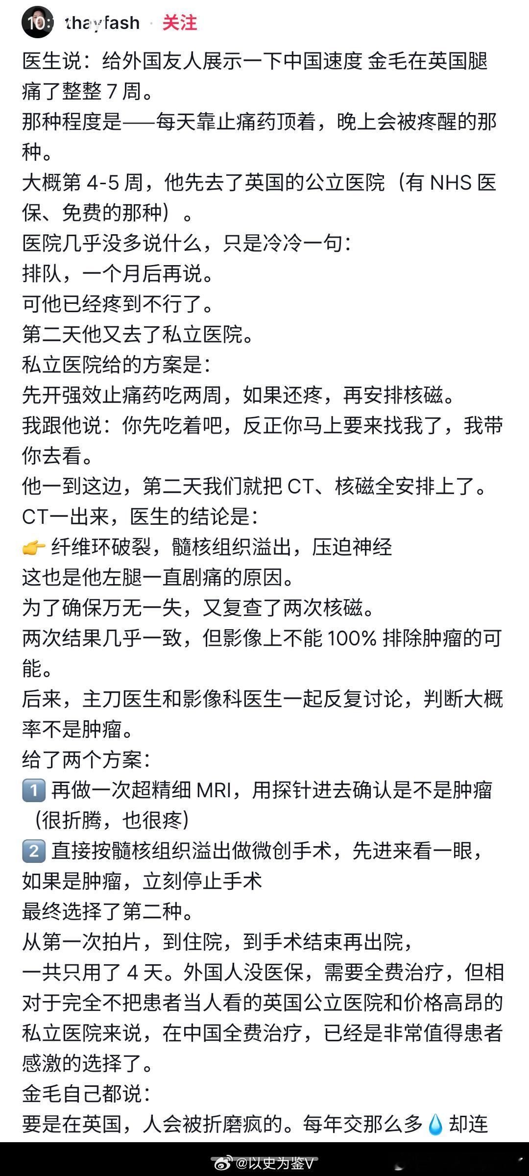 在英国痛了7周到中国四天就治好了以前老公知说中国医疗水平不行还收费,外国都是免费医疗,私人医生……现在东西网友一对账才发现,西方医疗既不免费又不迅速还不报销……英国金毛小哥在大英公立私立医院都跑了几圈,腿疼了7周硬是啥都不查就排队……跑中国来四天就检查手术全治好了……这个真实故事国外的《知音》《读者》《意林》赶紧安排上啊!另外我真的建议国家专门出台外国人来华医疗通道,找一些城市的医院当做试点,价格可以适当抬高一点,高档套餐可以多安排几个,什么翻译、护工、中式营养餐……甚至还可以教他们打太极恢复身体,喝枸杞养生……这一套下来,不仅治好了病,还把中华文化全输出了,还推广了中式的各种产品。这个和免签政策搭配使用,效果更佳