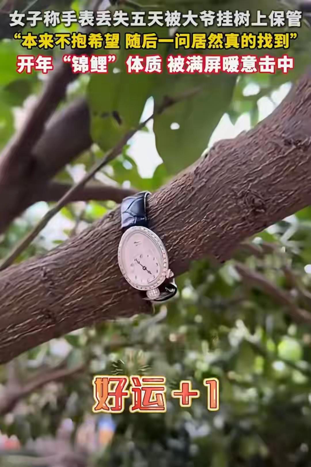 长沙这位小姐姐也太幸运了!丢了块近40万的宝玑名表,五天后抱着碰碰运气的心态回五一广场公园找,随口问了位听歌的大爷,没想到直接圆梦! 大爷捡到这块天价手表,没揣兜里也没上交,就朴实的挂在树上等着失主来找,这份纯粹的拾金不昧,真的太戳心了。 40万的表有价,这份刻在骨子里的善良无价!新年第一天的这份温暖,是最治愈的开年好运,小姐姐妥妥的开年锦鲤,大爷更是人间美好本身❤️