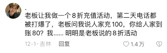 老板让我做一个8折充值活动,第二天电话都被打爆了,老板问我说人家充100,你给人家到账80?我......明明是老板说的8折活动