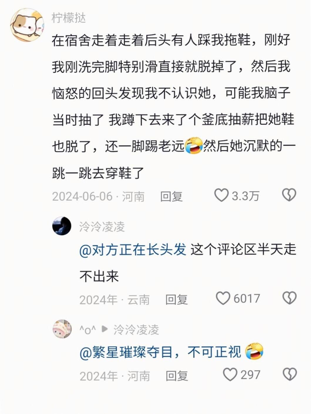 在宿舍走着走着后头有人踩我拖鞋,刚好我刚洗完脚特别滑直接就脱掉了,然后我恼怒的回头发现我不认识她,可能我脑子当时抽了我蹲下去来了个釜底抽薪把她鞋也脱了,还一脚踢老远,然后她沉默的一跳一跳去穿鞋了