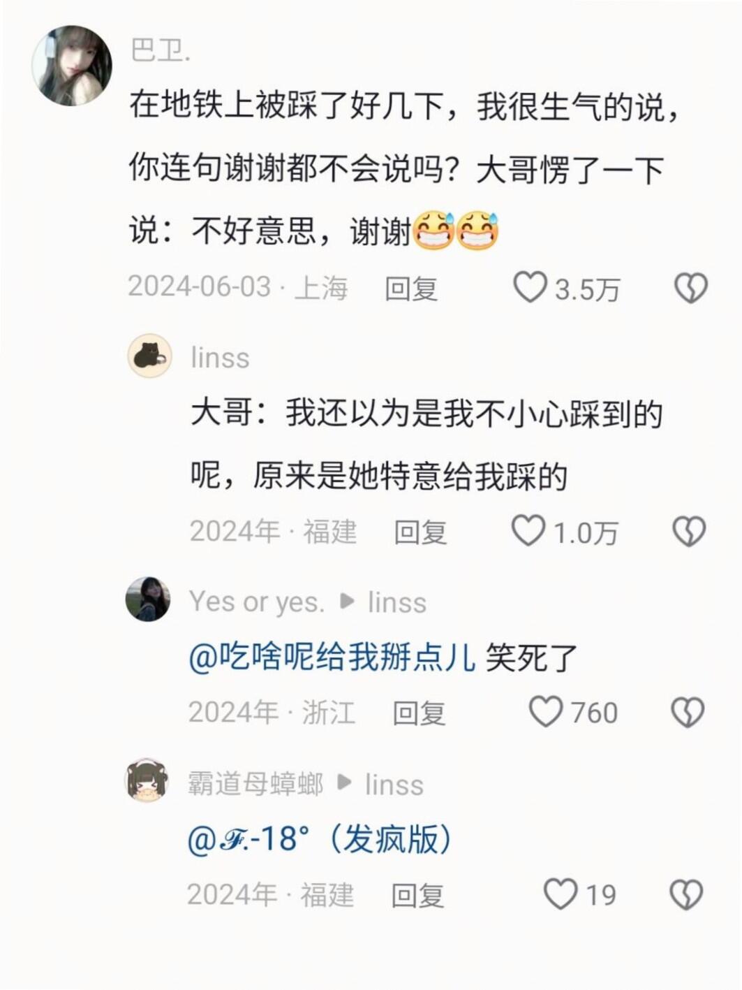 在地铁上被踩了好几下,我很生气的说,你连句谢谢都不会说吗?大哥愣了一下说:不好意思,谢谢