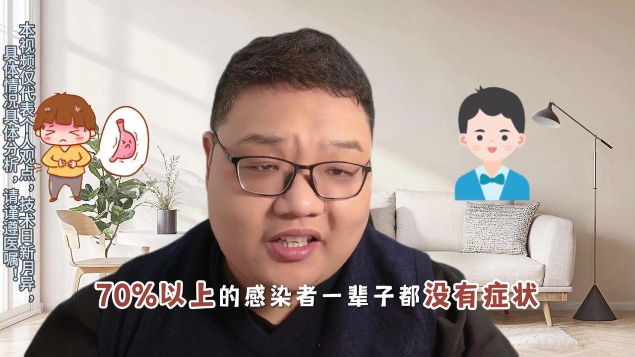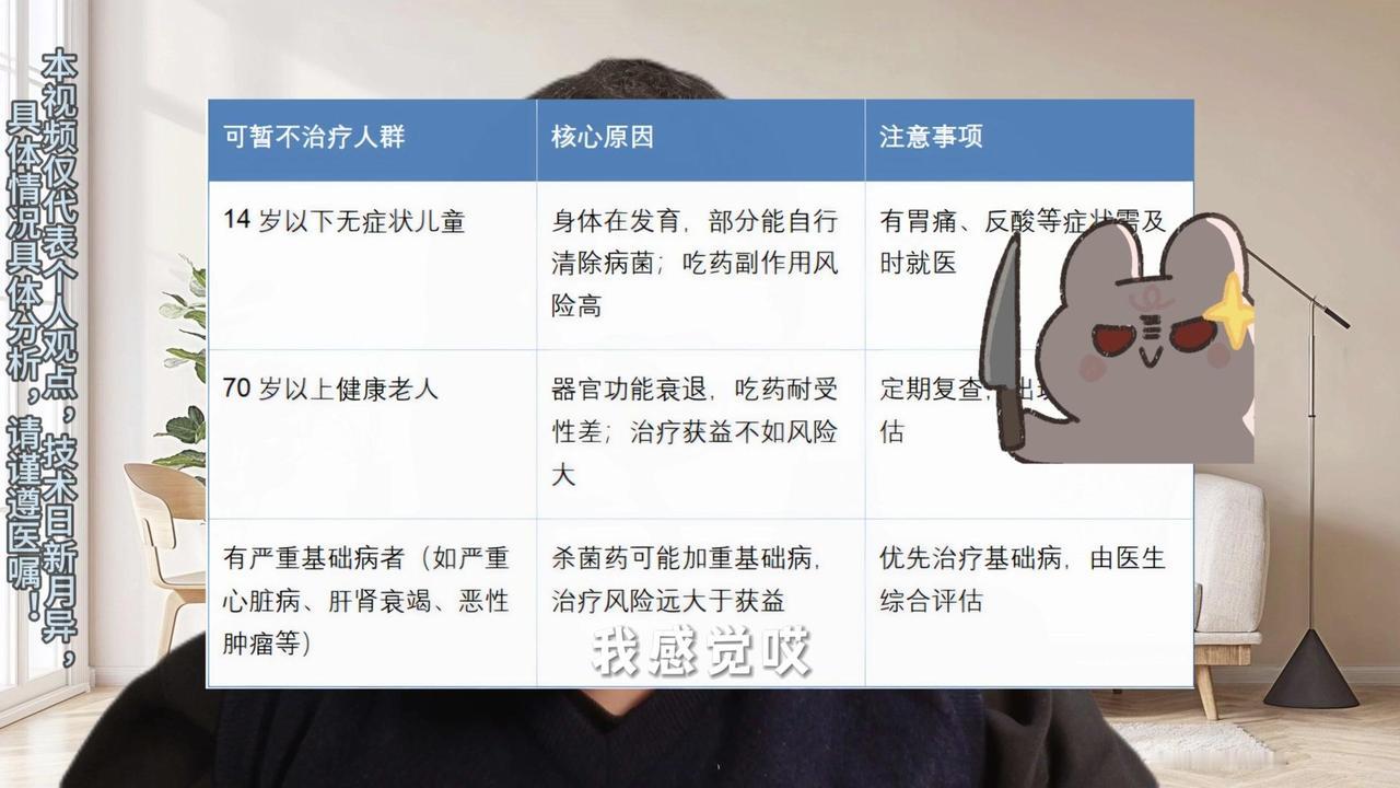 感染≠胃癌!三类人可暂不治疗,你在其中吗? 我国成人感染率高达41.5%,每两人就有一个阳性。但指南明确,感染幽门螺杆菌不代表会得胃癌,70%的感染者一辈子无症状。只有有基础胃病家族史、长期饮食不规律、抽烟喝酒的人群,风险才会升高。 以下三类人即便阳性也可暂不治疗: 1️⃣14岁以下无症状儿童:孩子正处于身体发育阶段,杀菌药物剂量大,可能扰乱菌群,损伤肝肾。若无症状,建议在医生指导下使用。 2️⃣70岁以上健康老人:身体机能衰退,对药物耐受性差。即便未来10-20年发展为胃癌,70岁老人的概率极低,强行杀菌反而可能得不偿失。 3️⃣严重疾病患者:如心脏病、严重肝肾衰竭、肿瘤化疗期人群,本身肝脏负担已重,杀菌可能加重肝肾损伤,危及生命。 如果有胃痛、反酸,或胃癌家族史、常抽烟喝酒,建议做胃镜检查,由医生判断是否需要杀菌。日常注意分餐、使用公筷,有条件可备消毒柜,不必过度焦虑。