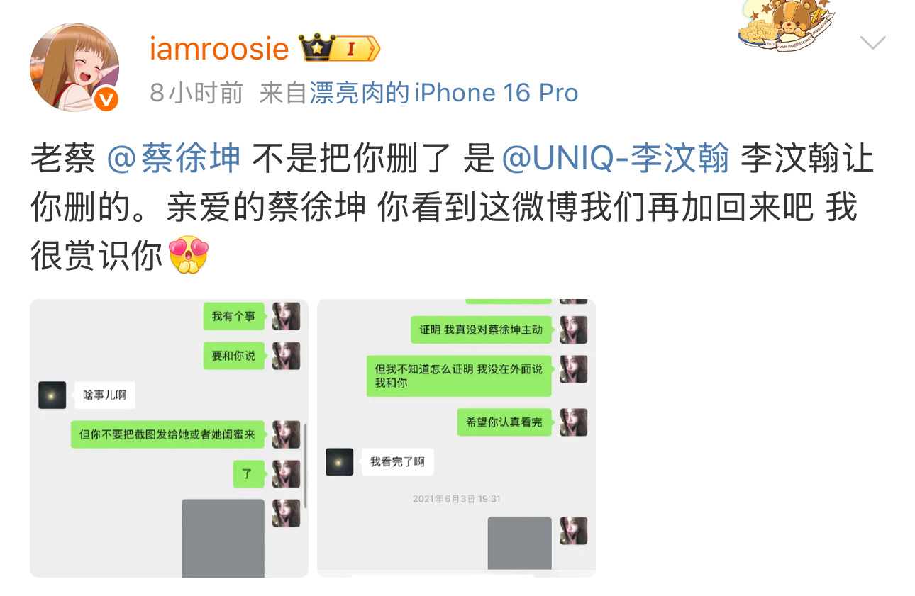 iamrooise一句姐30了,所有顶流都睡完了,直接在新年的娱乐圈点了一把火,直接指林更新、蔡徐坤、鹿晗、范丞丞、檀健次、周奇、黄明昊等男艺人,还在群里爆料说关晓彤和王安宇在一起了。目前林更新、鹿晗、范丞丞、黄明昊和王安宇工作室已经出面澄清。个人经验来看,爆料多为一些无法证明真假的聊天记录,没有实质性的内容,所以在这里做个推断,这件事真的内容不多,完全只能当吃瓜来看所有顶流都睡完了所有顶流都睡完了