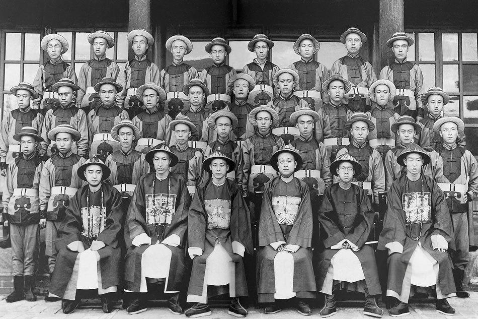 1907年,清末老照片,山西大学堂,即将赴日本留学的学生与教师合影。 照片中,约40多名年轻学生整齐排成四排,穿着统一的清代学生装,多数戴礼帽。前排坐着几位教师或长者,穿着传统官袍,佩戴珠链,表情严肃而庄重。 1907年正值清末“新政”高潮,废科举、兴学堂后,留学成为救国图强的热潮。日本因“路近费省、语言相近、文化相通”,成为中国学生首选目的地。1905-1907年,赴日留学生人数激增至上万人高峰,许多省份官派学生学习速成师范、法政、军事等实用科目。 山西大学堂成立于1902年,是中国最早的三所国立大学堂之一(与京师大学堂、北洋大学堂齐名),分中斋和西斋。这批学生很可能来自中斋或预科班,被选派赴日学习师范、教育或实业,以回国后兴办新式学校、推动山西近代化。照片捕捉了他们出发前的集体留影,象征着从“闭关锁国”到“睁眼看世界”的时代转折。